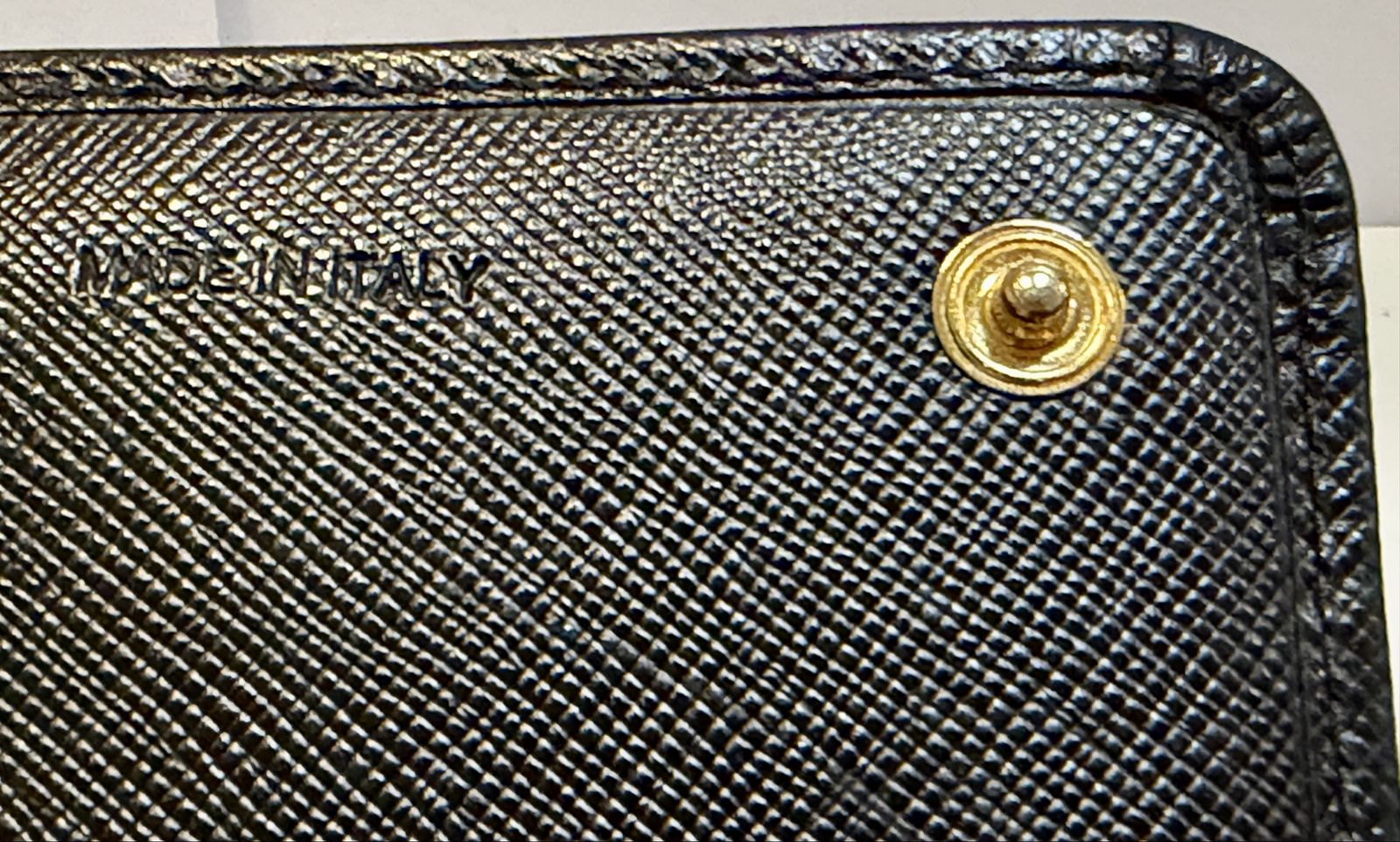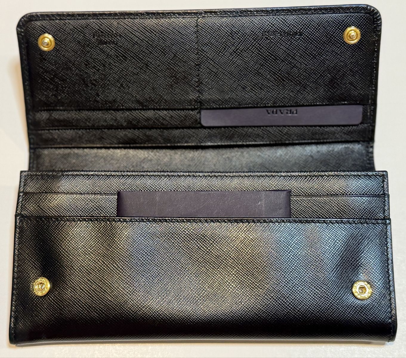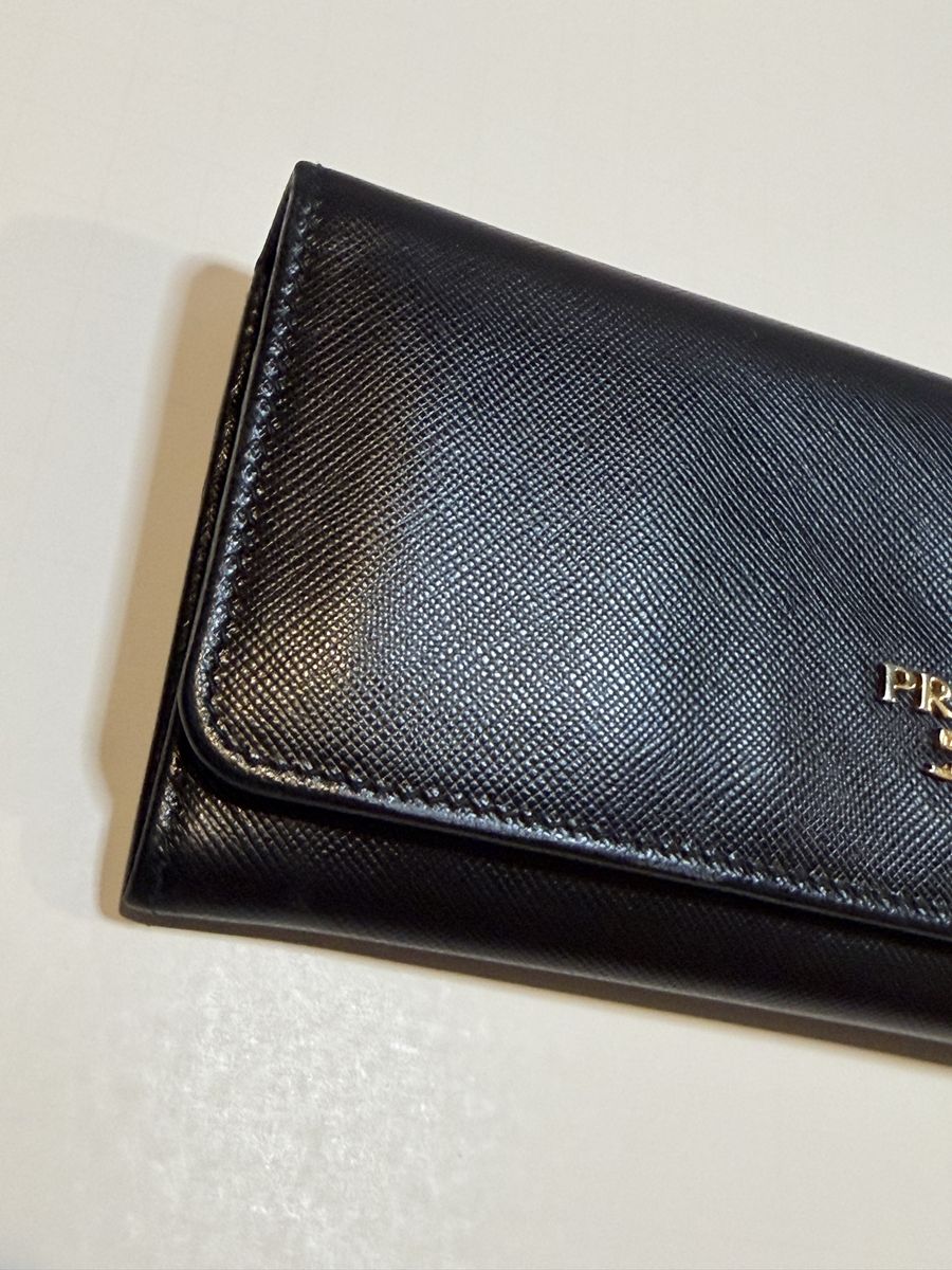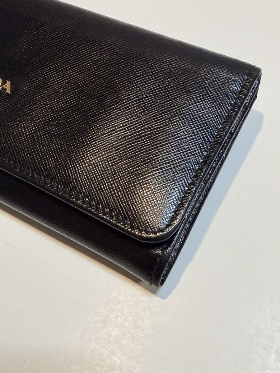 Authentic Prada black Saffiano leather wallet/clutch with gold Prada Milano logo and zip coin pocket.