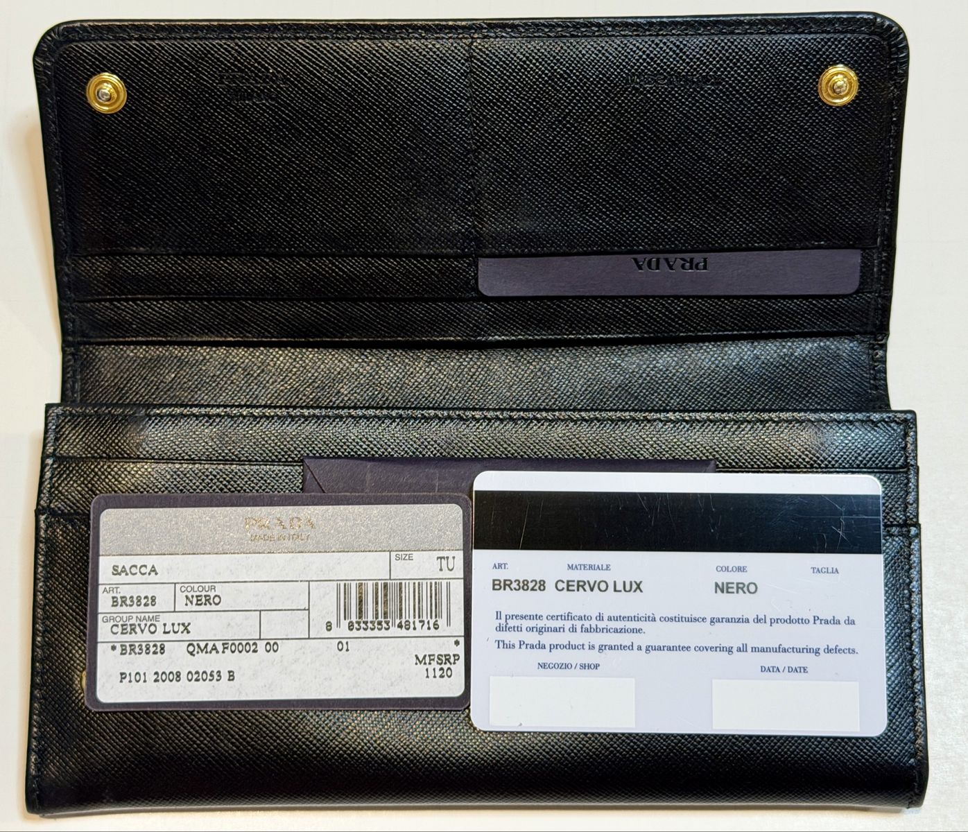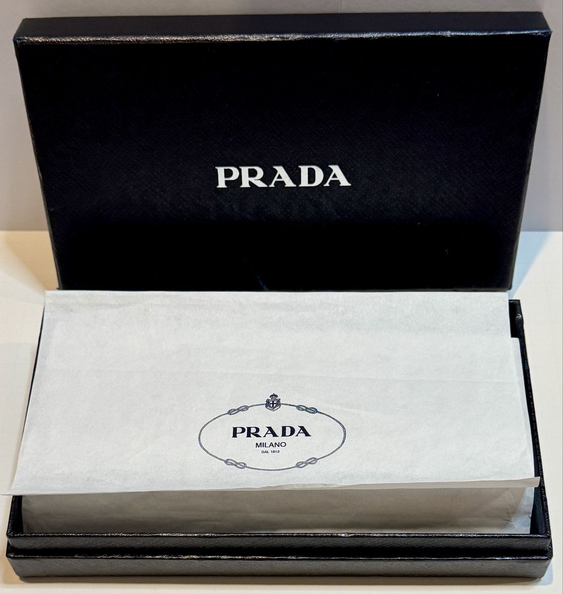 Includes original Prada box, tissue paper, authenticity card, and product tag.
