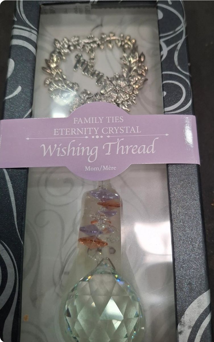 Mom Eternity Crystal Wishing Thread measures approximately 3" x 3", a round-shaped crystal prism that measures 2" x 2" and is accented by smaller clear, soft pink and purple coloured crystals hanging a total of 14" from a metal ring.