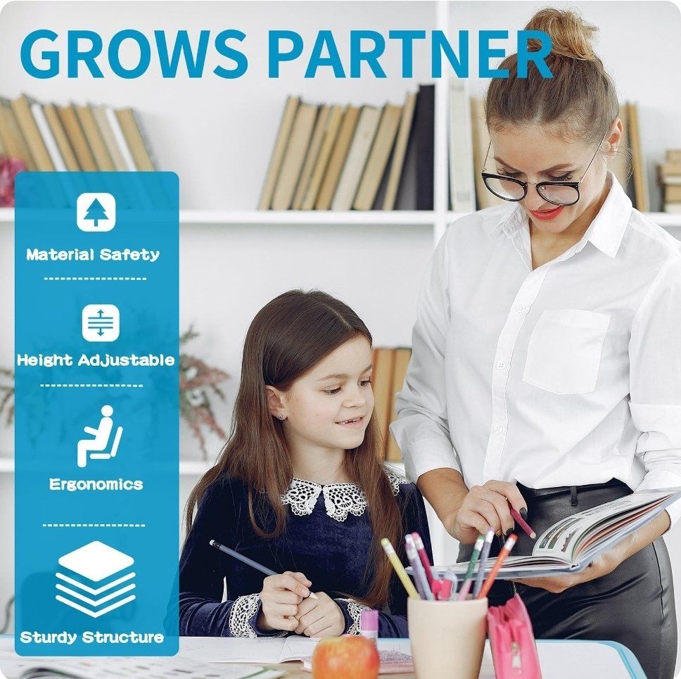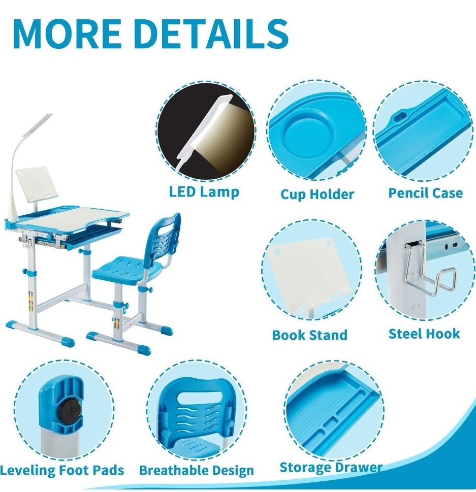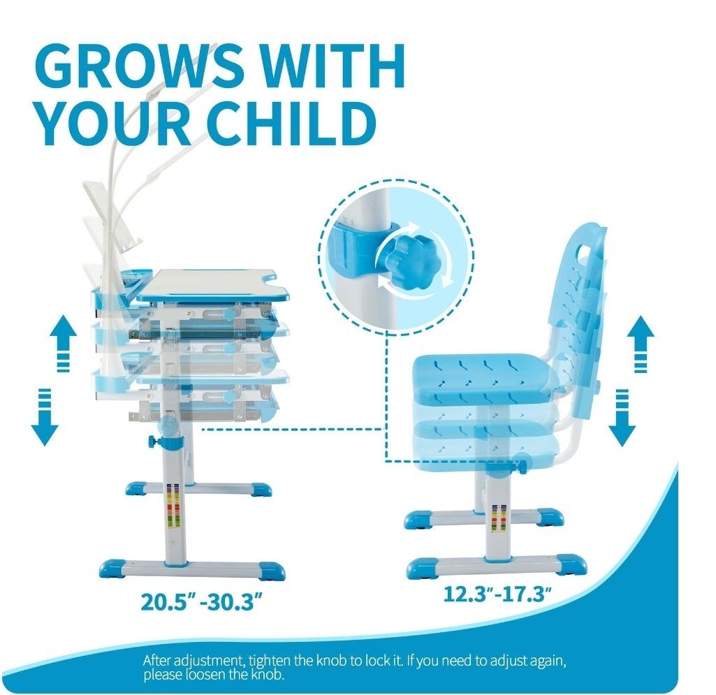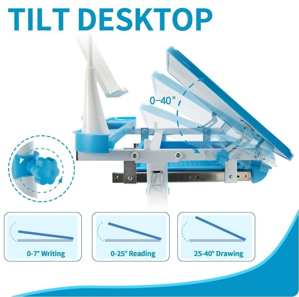 Diroan Kids Functional Desk and Chair Set, Ergonomic Height Adjustable Children School Study Desk with Tilt Desktop, Book Stand, LED Light, Metal Hook and Storage Drawer for Boys Girls(Blue)