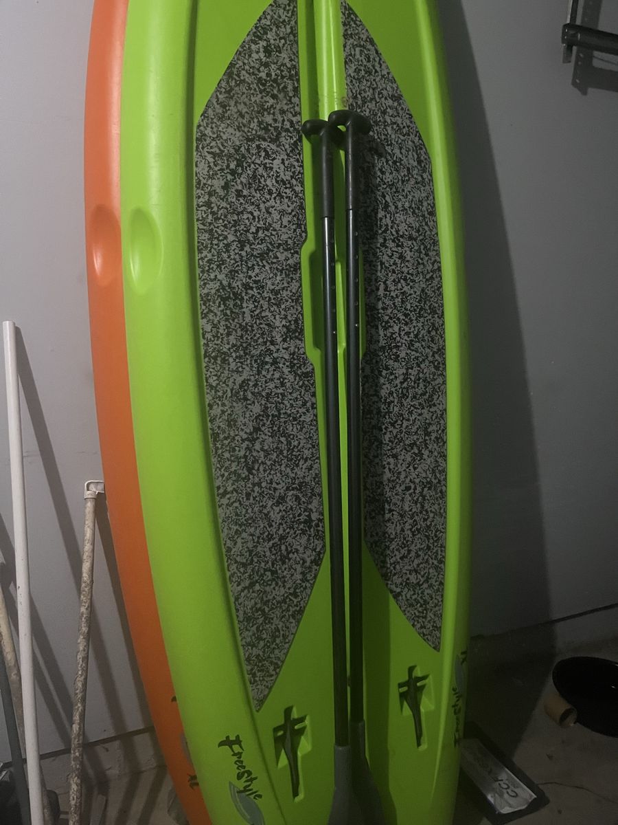 VenmoHave 2 available and comes with paddles. Price is for both The Lifetime Freestyle™ Multi-Sport Paddleboard is 9' 8" long x 35.5" wide x 6" thick. It has EVA foam pads, paddleboard leash attachment loop, and (2) injection molded fins.