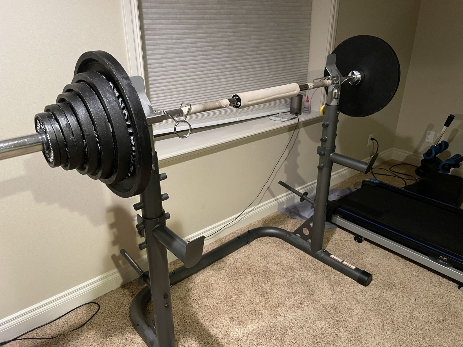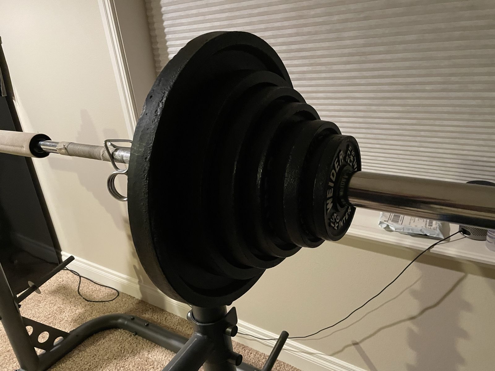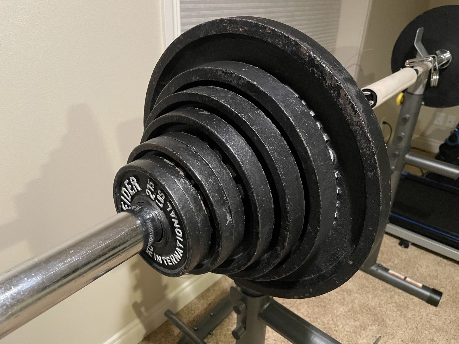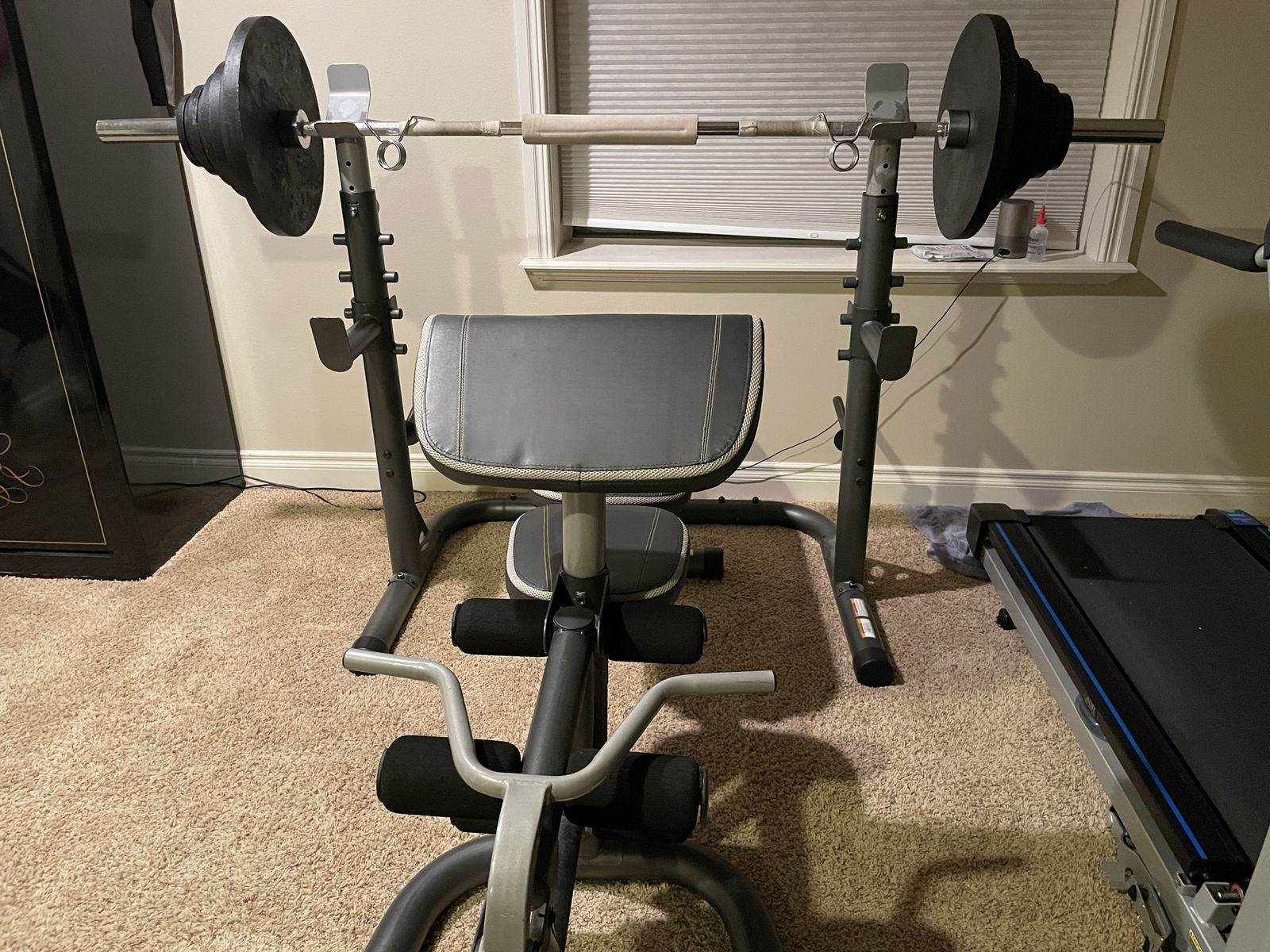 VenmoComplete weight set includes the following: 1-45 # Olympic Bar 2-44# plates 2-33# plates 2-22# plates 2-11# plates 4-5.5# plates 4-2.5# plates Bench and Rack $350 without the bench. 284# total edit in plates plus 45# bar = 329 pounds.