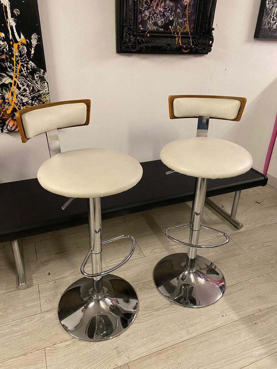 This set of two modern bar stools delivers a clean, upscale look with strong functionality. The cream leather seats are smooth and comfortable, paired with a warm wood accent backrest and a polished chrome base for a refined, contemporary feel.