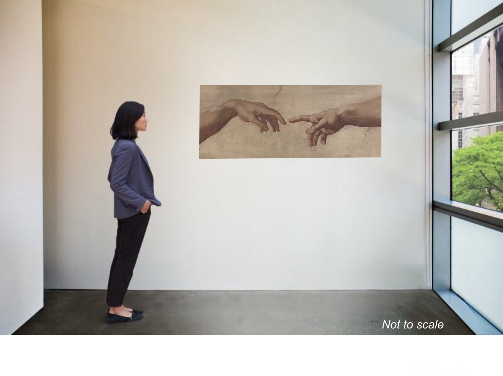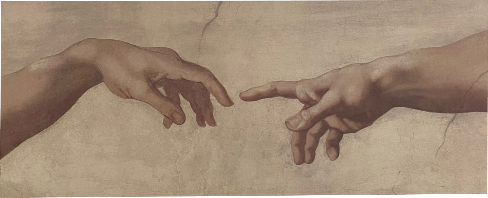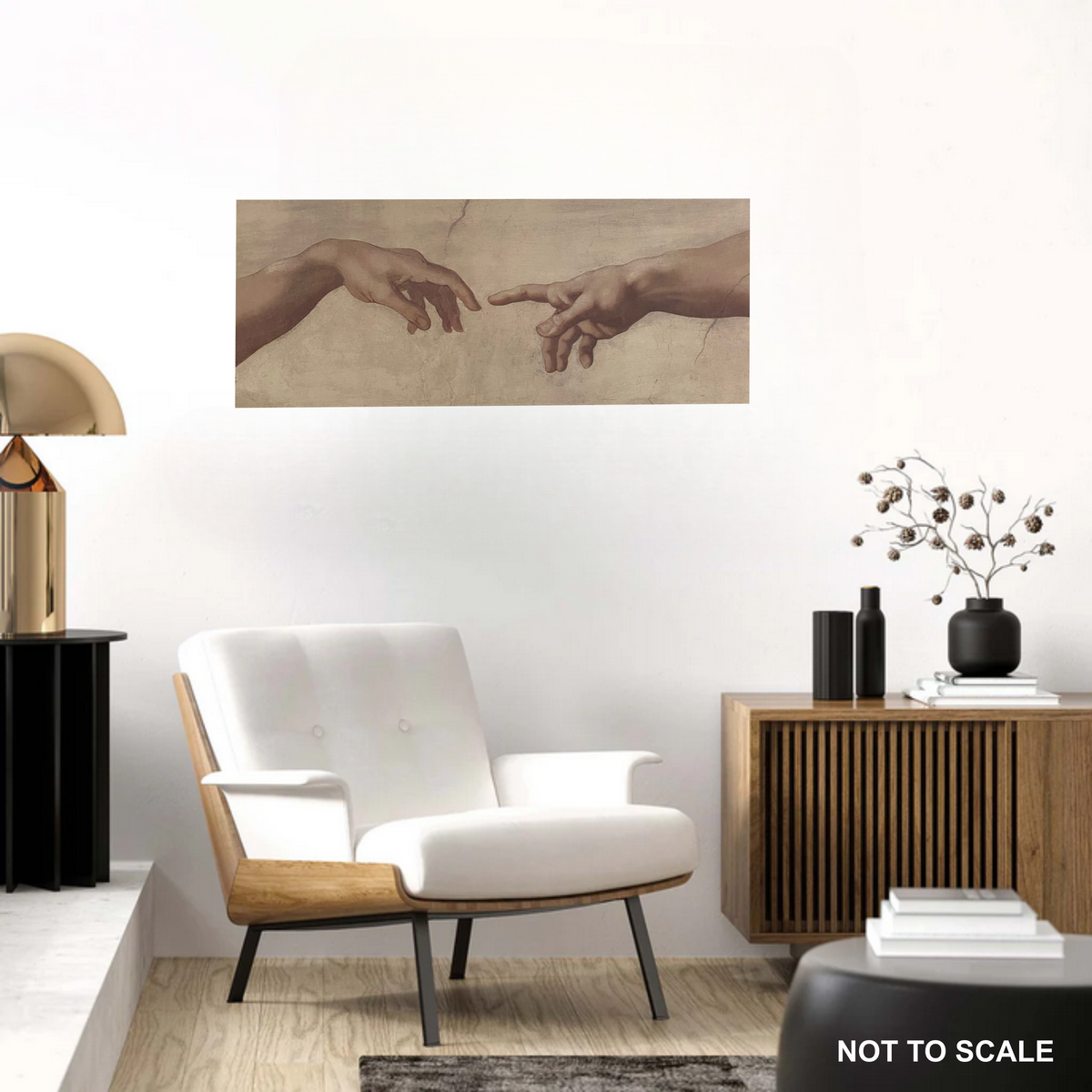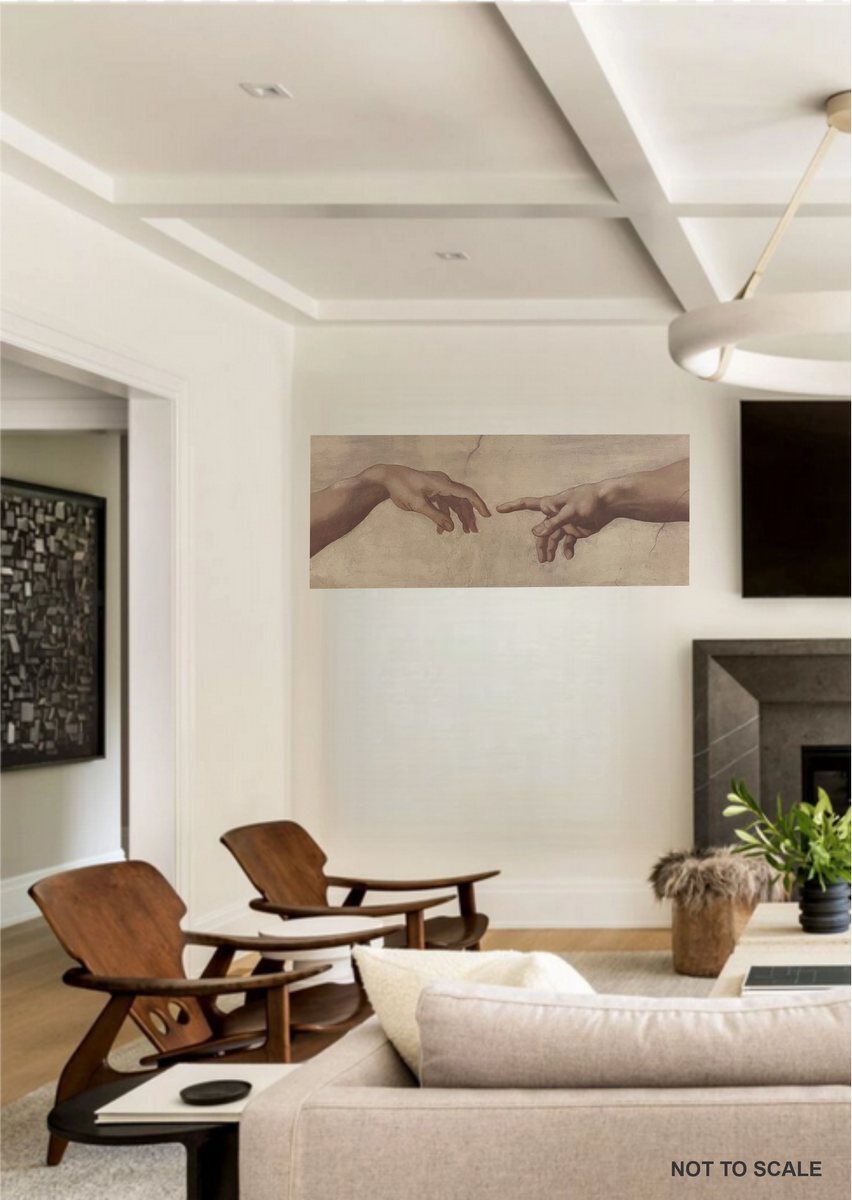 This elongated, gallery-style print features the iconic hands from The Creation of Adam, reimagined in a clean, modern format. The wide 22" x 55" layout makes it a strong focal piece—ideal above seating, beds, or entryways.
