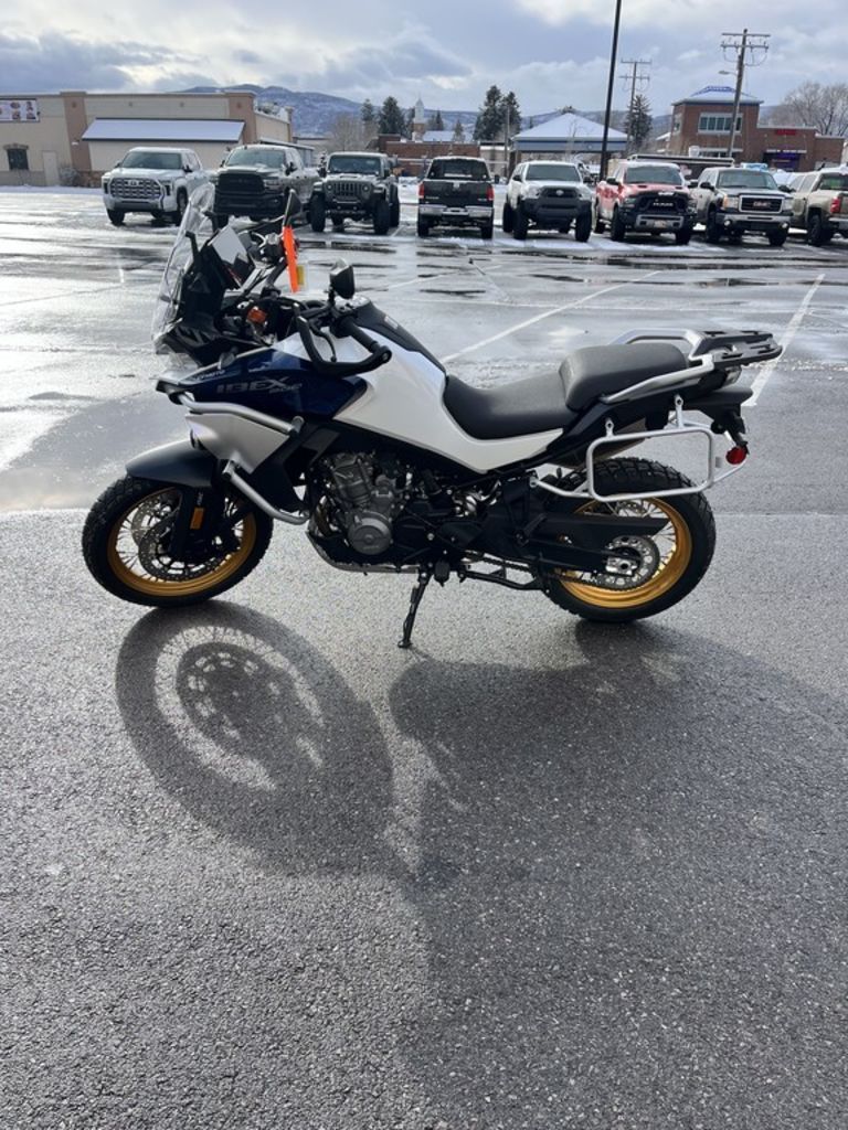 2025 CFMOTO Ibex 800 E It’s back, and with a few new tricks up its fender including six ride modes—Sport, Rain, Off-Road, Off-Road Plus, All Terrain, and All Terrain Plus. That 8" MMI screen is a nice upgrade, too. This beast retains its heart and soul with the reliable 799cc engine, KYB suspension, and J.Juan brakes. Returning features include cruise control, heated grips and seat, up and down quick shifter, and tubeless tires that laugh at sharp rocks. Ride it 365 days a year. No adventure is too big. No errand is too small. Just give that throttle a twist and go. Features may include: Styling The Ibex 800 E features smart and contemporary styling with design cues from the renowned Kiska studio. The bike's sleek lines, aggressive stance, and premium finishes make a bold visual statement. Its modern look ensures you'll turn heads both on and off the road, setting a new standard for mid-sized adventure bikes. 8” MMI Display Get a load of the massive 8” MMI touch screen, your window into a world of CFMOTO tech that keeps you informed and in control. Think of it as an extension of your riding brain. Use your smartphone for Apple CarPlay, Bluetooth, and CFMOTO RideSync™ connectivity. Incoming calls, message notifications, music playback, even navigation—it’s all in front of you. Blind Spot Monitoring Equipped with advanced blind spot monitoring technology, the Ibex 800 E offers an extra layer of safety by alerting you to vehicles in your blind spots. This system enhances rider awareness and reduces the risk of accidents during lane changes, providing peace of mind and making every ride safer and more enjoyable. Ride Modes Take control with six ride modes: Sport, Rain, Off-Road, Off-Road Plus, All Terrain, and All Terrain Plus. These modes automatically fine-tune your bike’s performance, managing ABS and Traction Control via throttle input to ensure optimal performance in any condition. Quick Shifter The bi-directional quick shifter eliminates the need to engage the clutch during upshifts and downshifts. Seamless power delivery during gear changes maintains momentum and prevents loss of traction. Electronic Throttle The Ibex 800 E is fitted with a state-of-the-art throttle control system, offering smooth and responsive acceleration. Whether you’re navigating tight city streets or tackling challenging off-road terrain, the precise throttle response ensures optimal power delivery and a more controlled, enjoyable riding experience. LED Lighting With a full LED lighting system, including high/low beam headlights, taillights, and indicators, the Ibex 800 E ensures superior visibility in all conditions. The bright, energy-efficient LEDs provide excellent illumination, enhancing safety by making sure you see and are seen. This modern lighting system also adds a sleek, contemporary aesthetic to the bike, complementing its adventurous spirit.