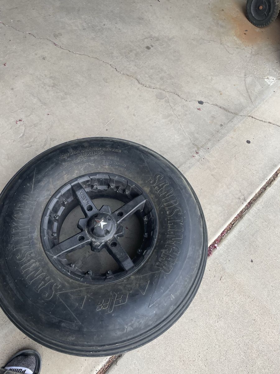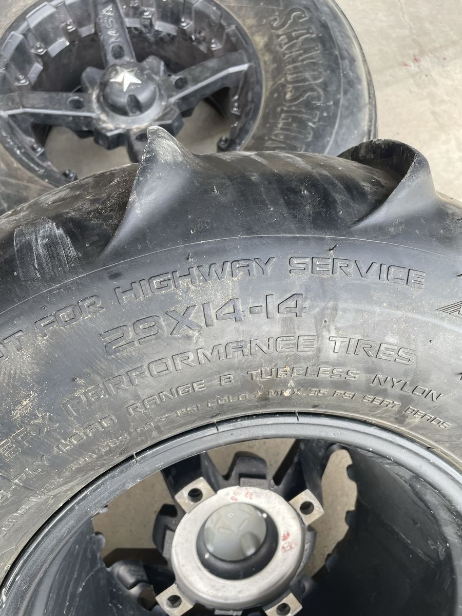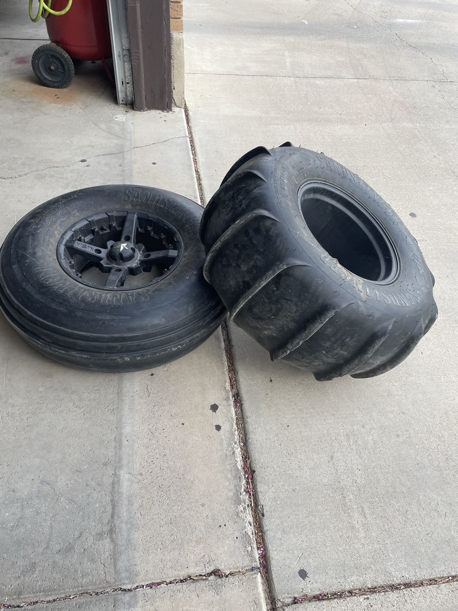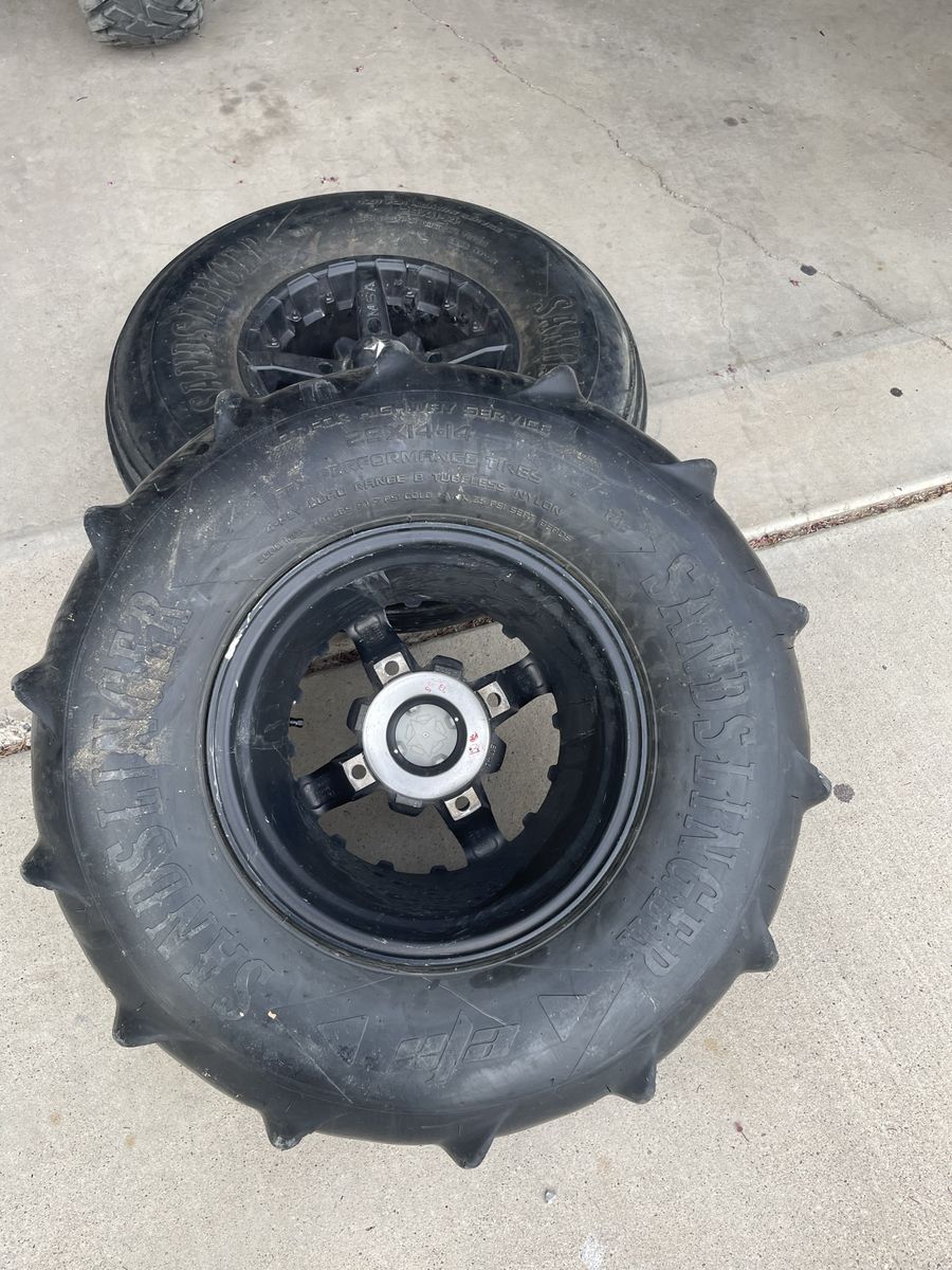 29 inch Sandslinger tires. 14 paddles on rear tires. 15 in wheels four lug pattern. $800 OBO.