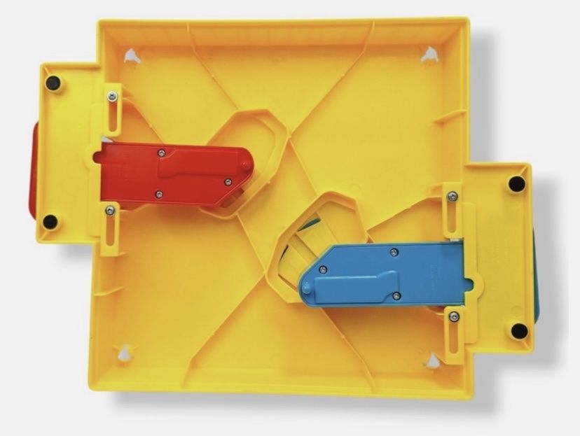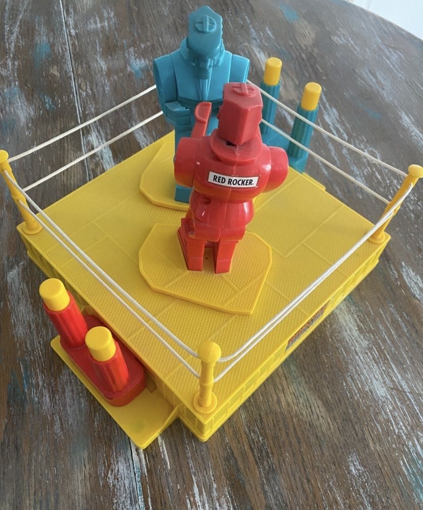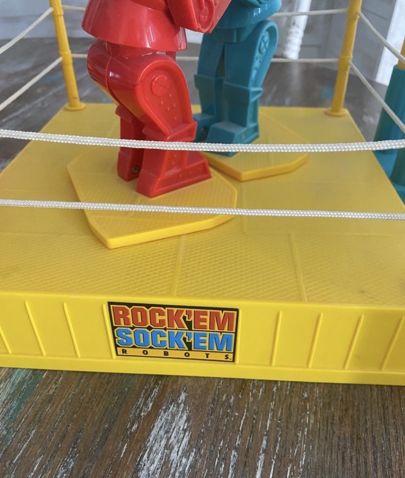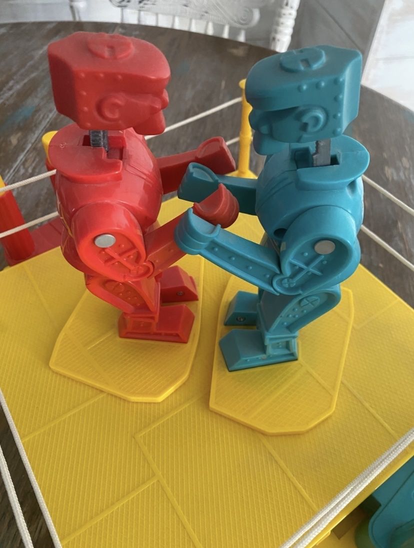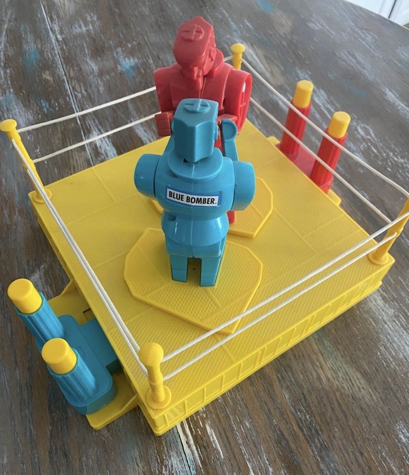 With two dueling robot boxers, Red Rocker and Blue Bomber, the game is won when one player knocks the other robot's head up and off the shoulders. Lightly used at grandparents home. Smoke free home.