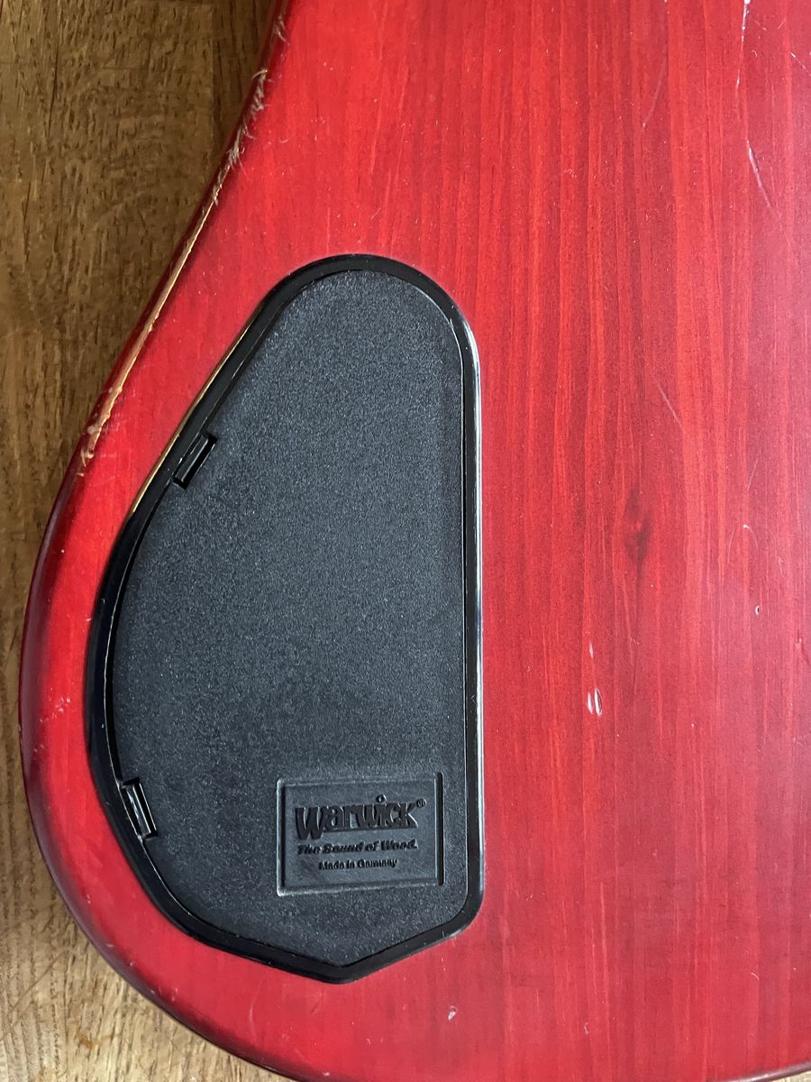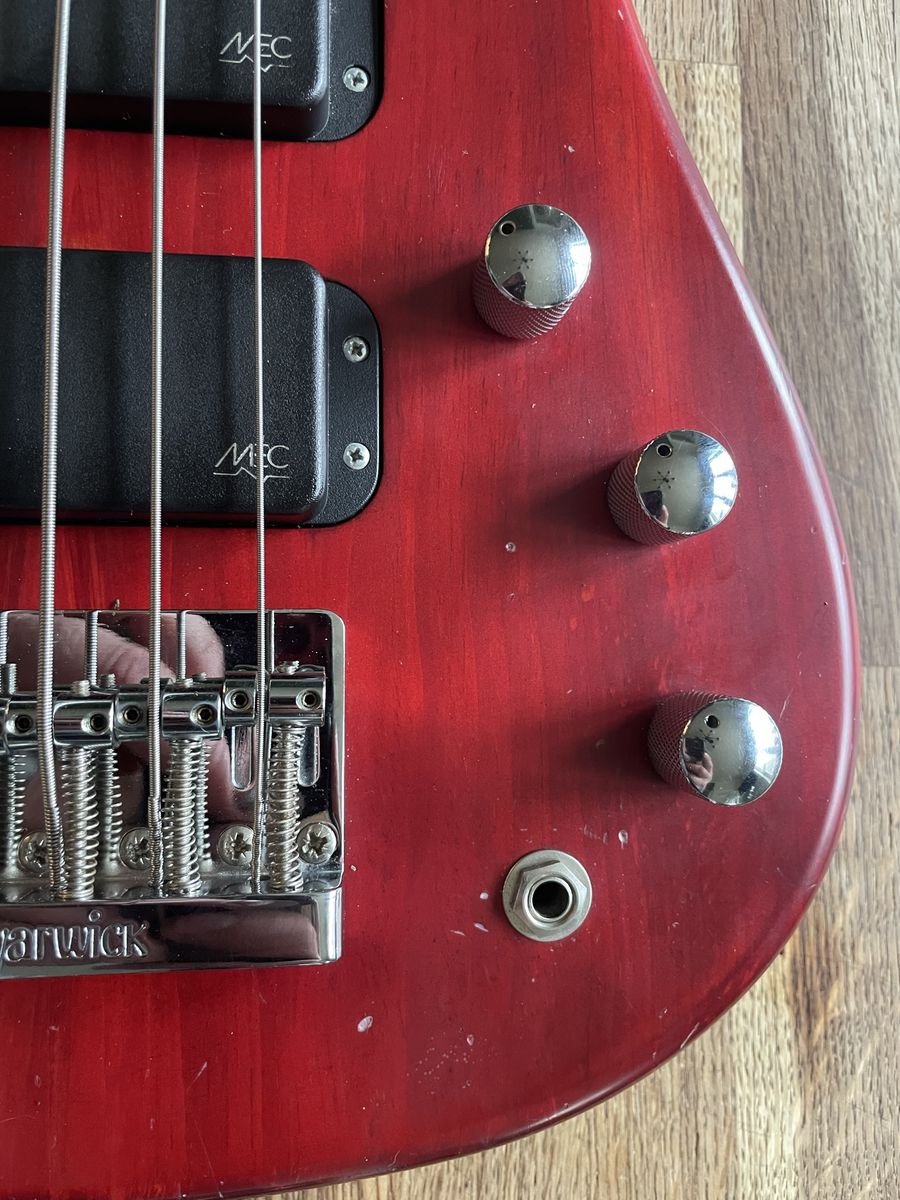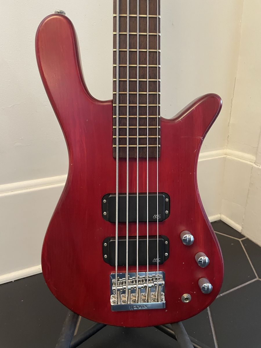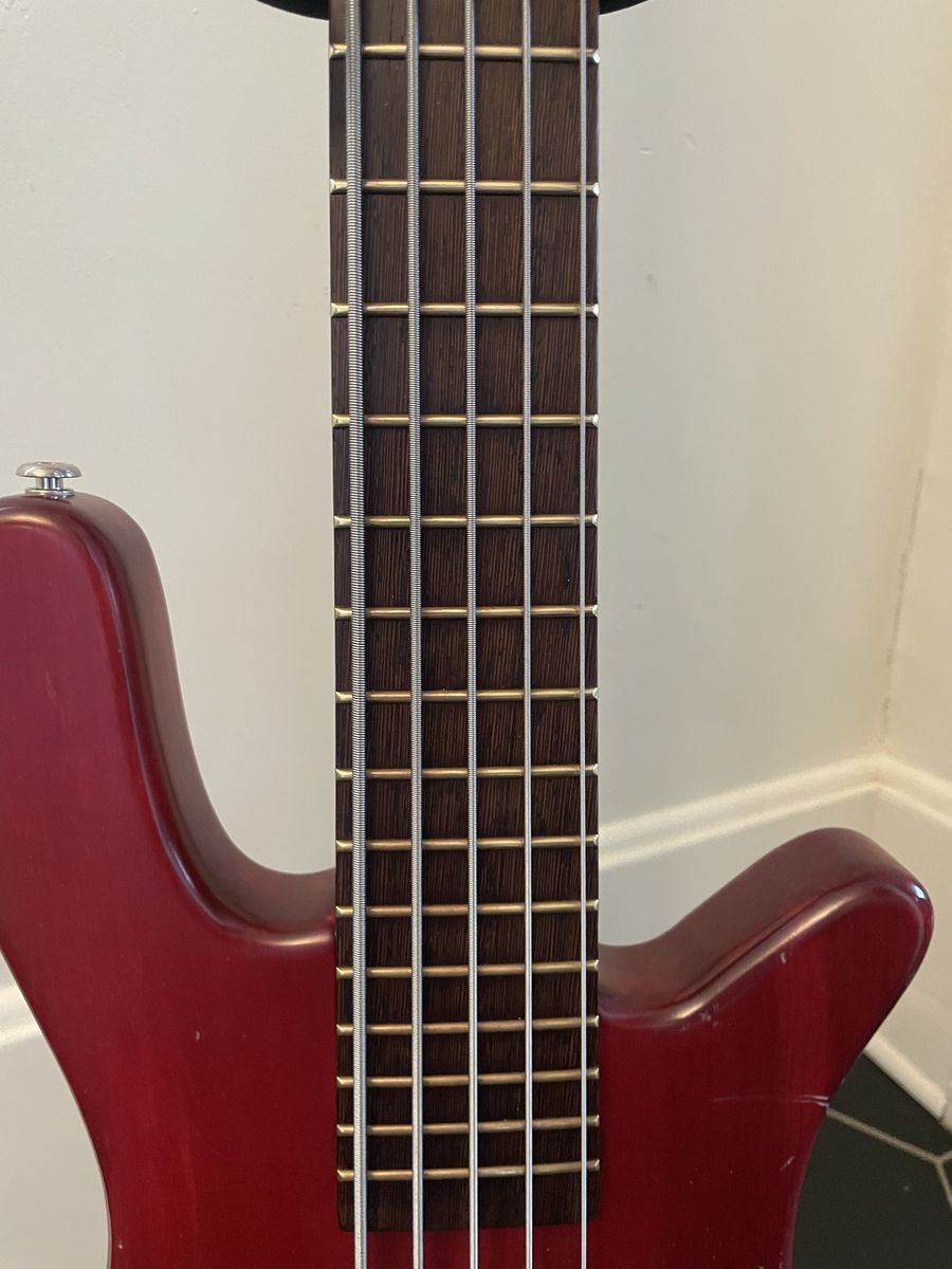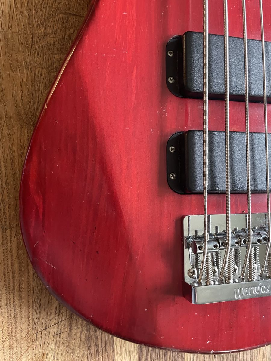 VenmoWarwick Streamer 5 string bass. Made in Germany 08/1999, Ovangkol neck, Wenge fingerboard, 2/3 piece solid Carolena body, burgundy red satin finish, passive MEC vintage humbuckers, passive MEC electronics (V,V,T controls), chrome hardware made for Warwick. Condition is used, but not abused. There are plenty of dings and nicks and some buckle rash, but nothing too terrible for a 27 year old instrument. The neck is in good shape and it is lovely to play, it has that nice Warwick growl. Fresh setup with Dunlop nickel wound strings.