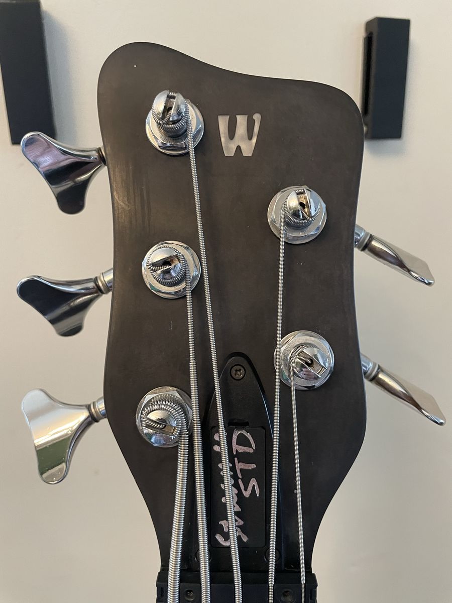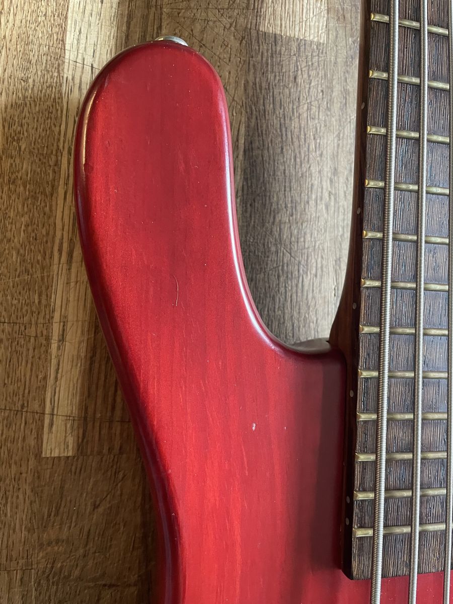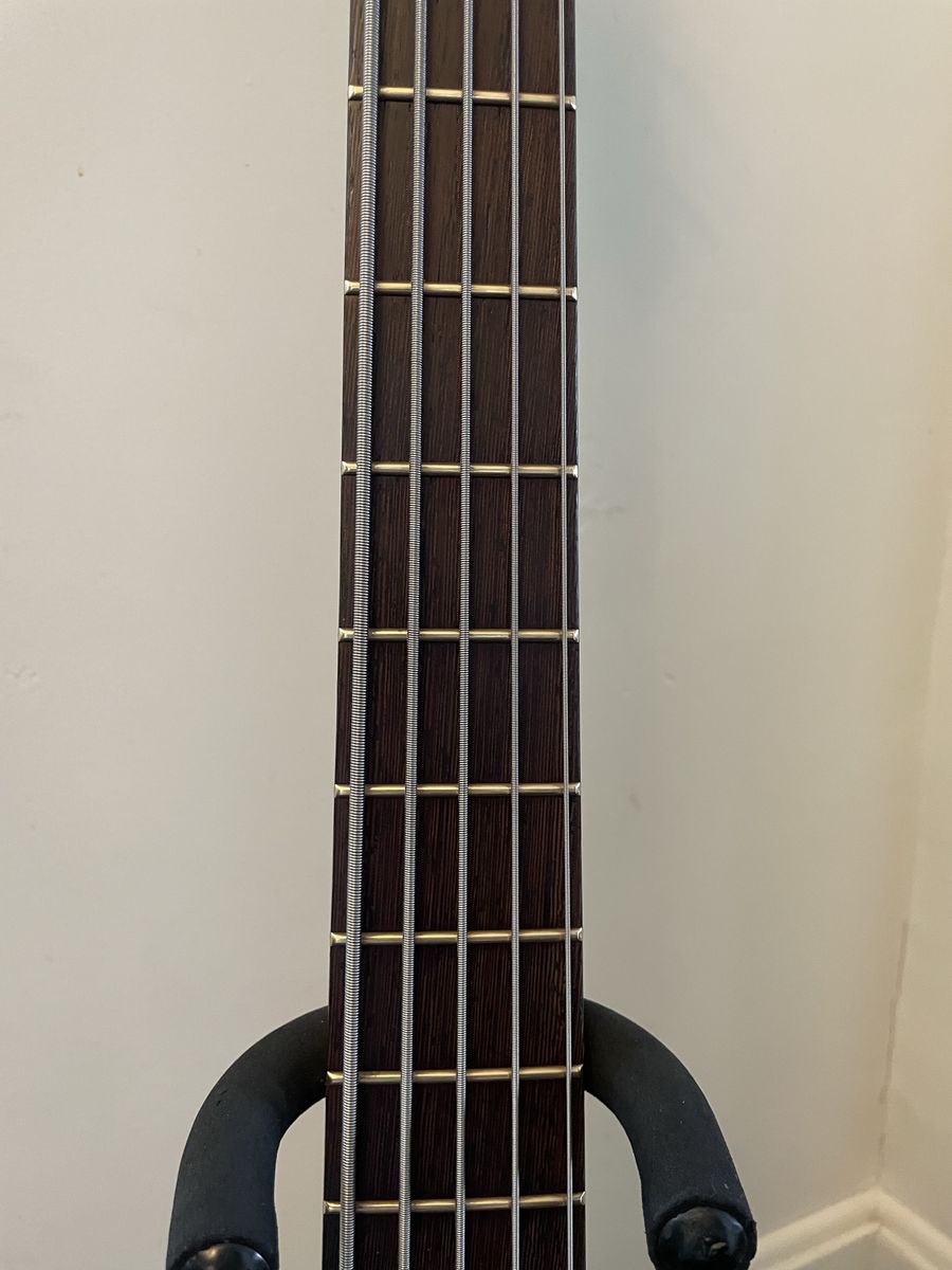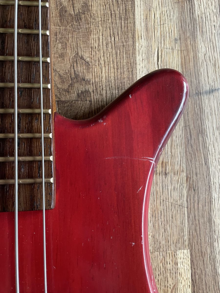 VenmoWarwick Streamer 5 string bass. Made in Germany 08/1999, Ovangkol neck, Wenge fingerboard, 2/3 piece solid Carolena body, burgundy red satin finish, passive MEC vintage humbuckers, passive MEC electronics (V,V,T controls), chrome hardware made for Warwick. Condition is used, but not abused. There are plenty of dings and nicks and some buckle rash, but nothing too terrible for a 27 year old instrument. The neck is in good shape and it is lovely to play, it has that nice Warwick growl. Fresh setup with Dunlop nickel wound strings.