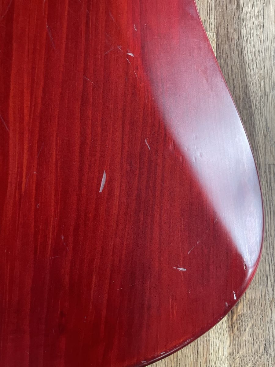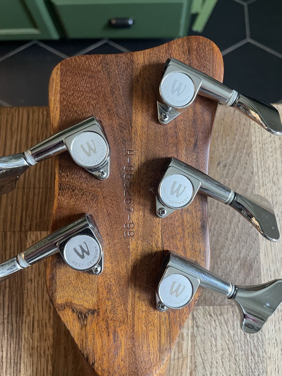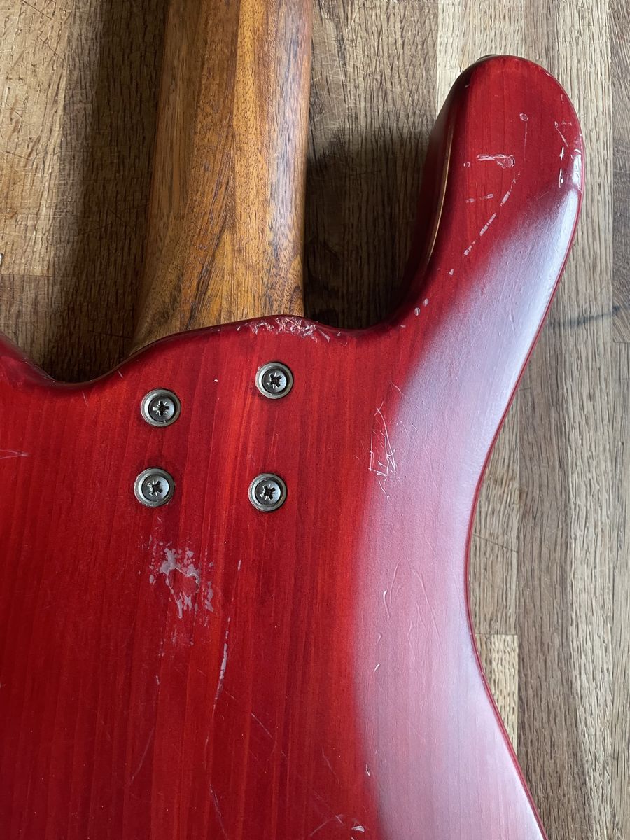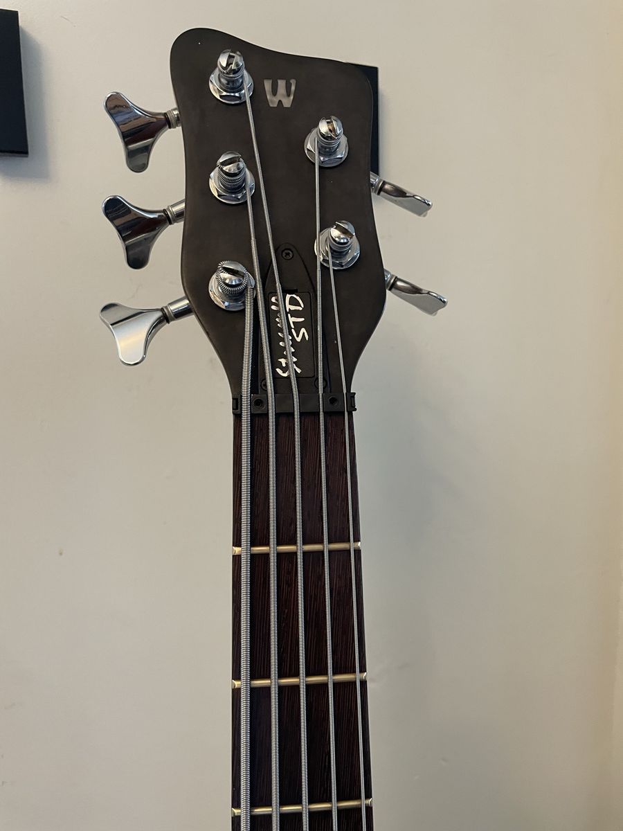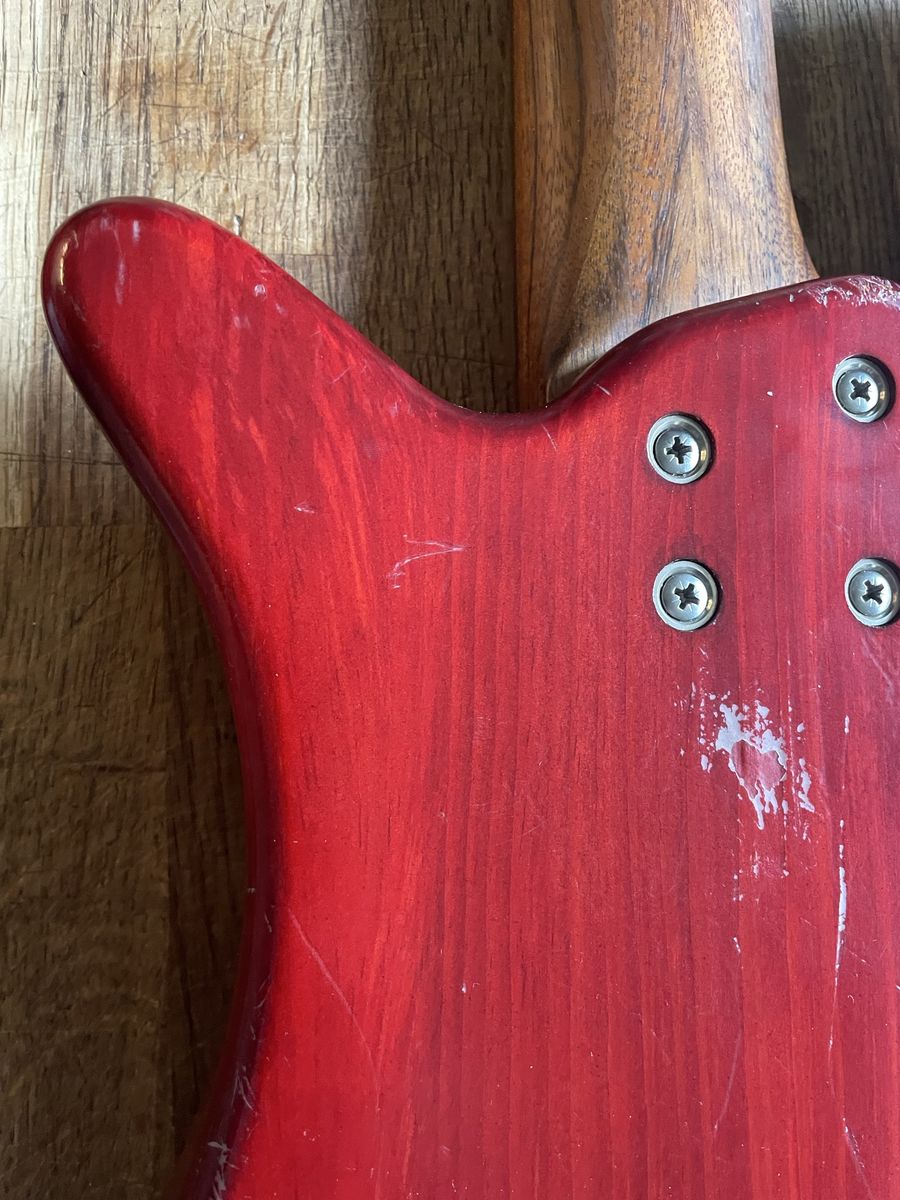 VenmoWarwick Streamer 5 string bass. Made in Germany 08/1999, Ovangkol neck, Wenge fingerboard, 2/3 piece solid Carolena body, burgundy red satin finish, passive MEC vintage humbuckers, passive MEC electronics (V,V,T controls), chrome hardware made for Warwick. Condition is used, but not abused. There are plenty of dings and nicks and some buckle rash, but nothing too terrible for a 27 year old instrument. The neck is in good shape and it is lovely to play, it has that nice Warwick growl. Fresh setup with Dunlop nickel wound strings.