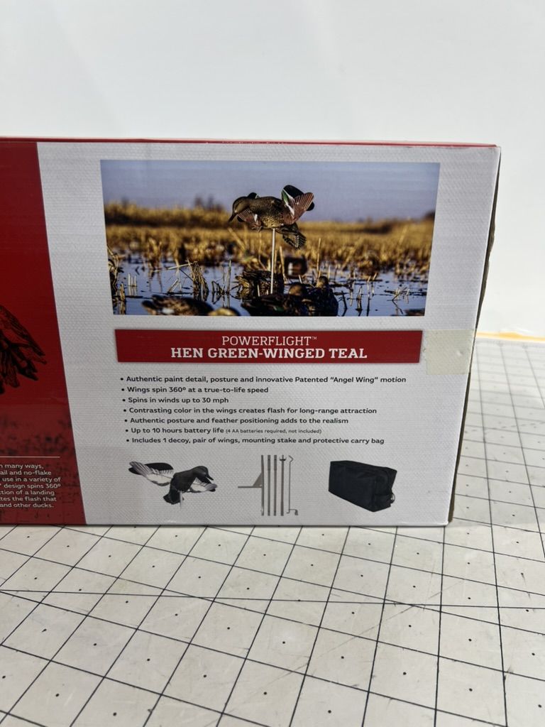 Realistic decoy with 360° spinning wings for life-like motion, contrasting wing colors for visibility, and easy portability in a protective carry bag.
