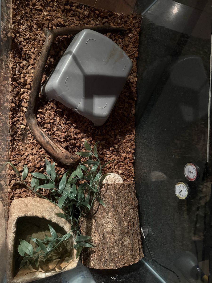 ApplePayhe’s a vpi axanthic lemonblast 3-4 years old very cool and calm snake never tried to bite, 40-50 gallon tank for him, heating lamp, heating pad, humidity gage and temp. gage, coconut husk for bedding included