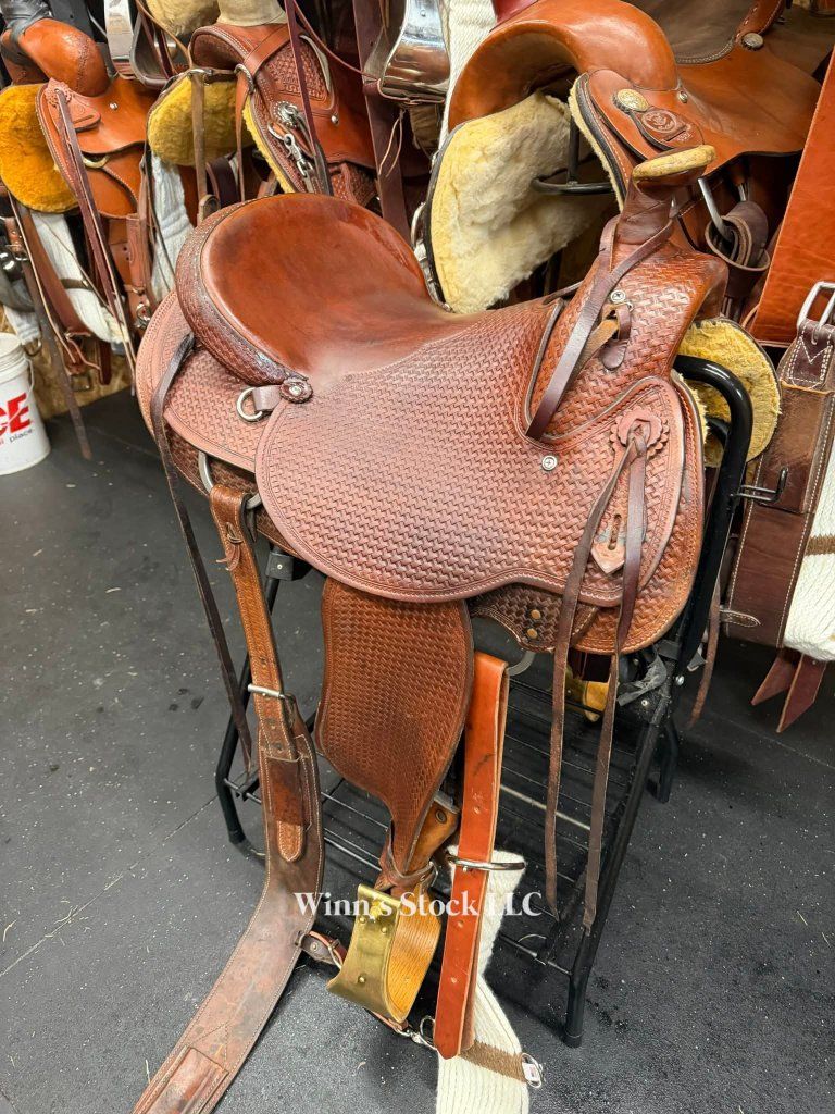 This saddle features a 16" hard seat, 6 1/2" gullet, QH bars, rawhide wrapped wood tree, post horn with leather rope strap, round skirt, 4 long leather ties, pre-twisted stirrups, back cinch, new front cinch, fleece is great, and weight is around 36lbs.