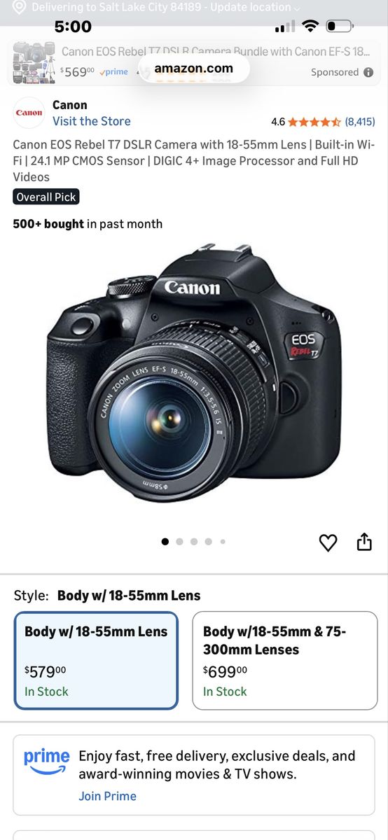 Nice cannon t7 camera in awesome working condition!! Comes with all you see pictured, bag, camera, charger, battery and lens! Looks and works great, all you guys should jump on this! This exact camera is 579.99 refurbished on Amazon right now as shown in photos! Don’t pay retail prices, call Dustin instead at 801-205-3404, I need it gone!