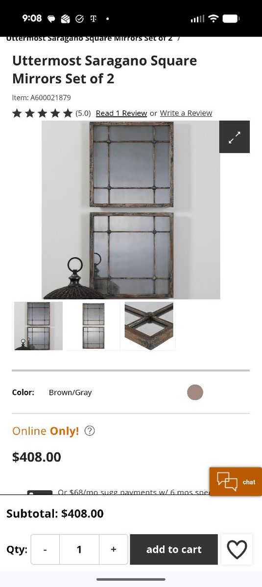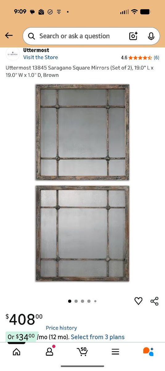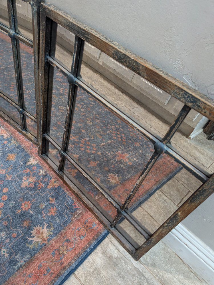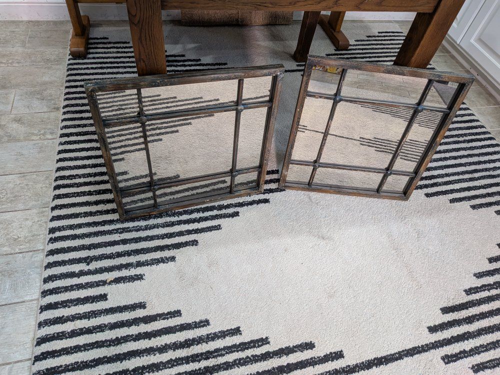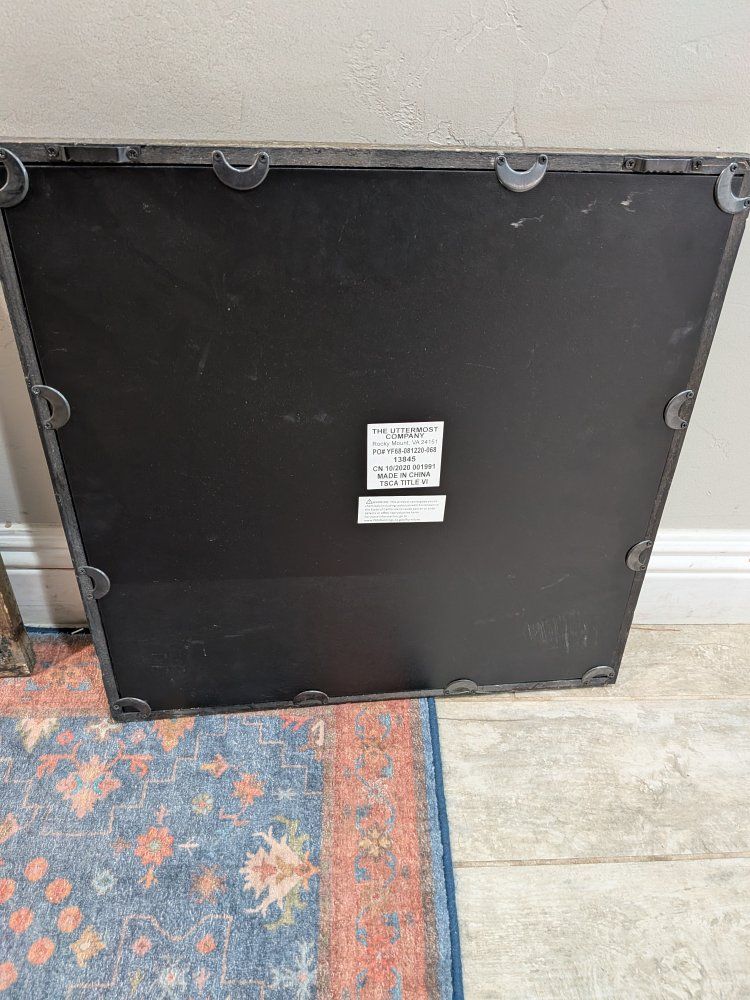 Uttermost Saragano Distressed 19" Square Wall Mirrors. Has a great farmhouse/outdoor vibe. Measurements and more details in photos. Originally $408. Selling the pair for $125