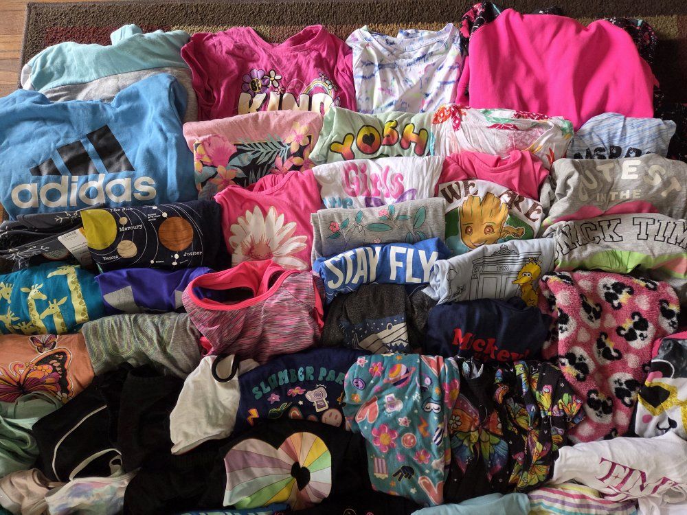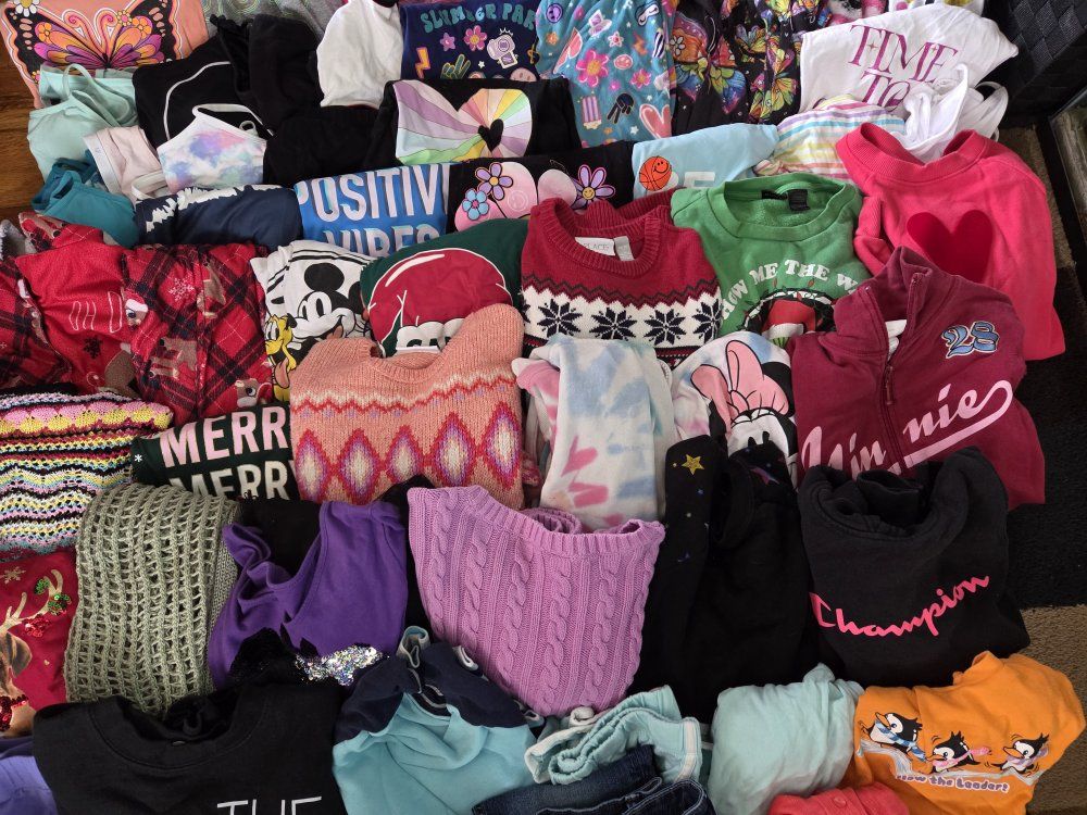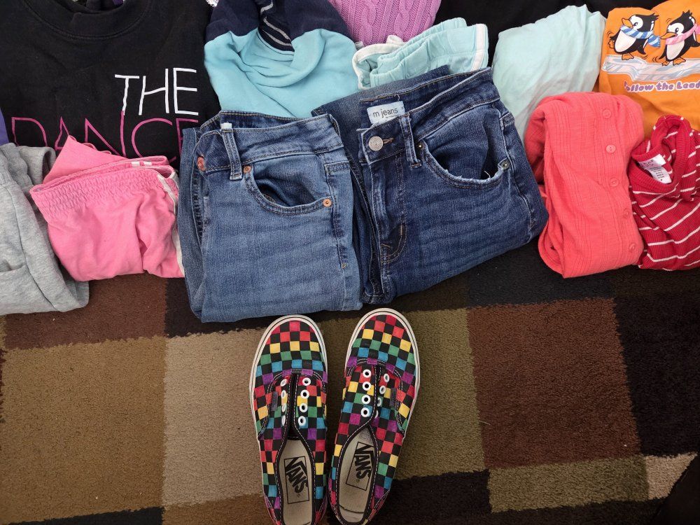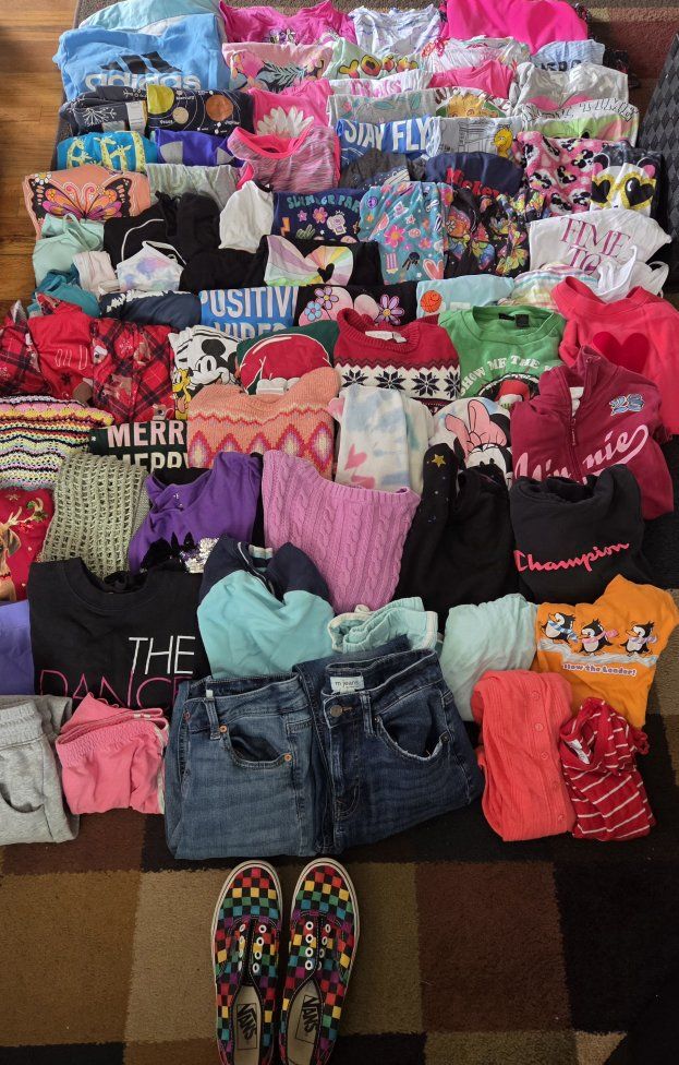 Over 80 cute girls clothes. Size M-XL. No rips or stains. Several still have tags and are brand new. Mostly tops of all kind. There are 2 pair of jeans that are bigger (size 2) and a pair of Vans (size 4.5). All these items are from a smoke free home. Please contact me by text.