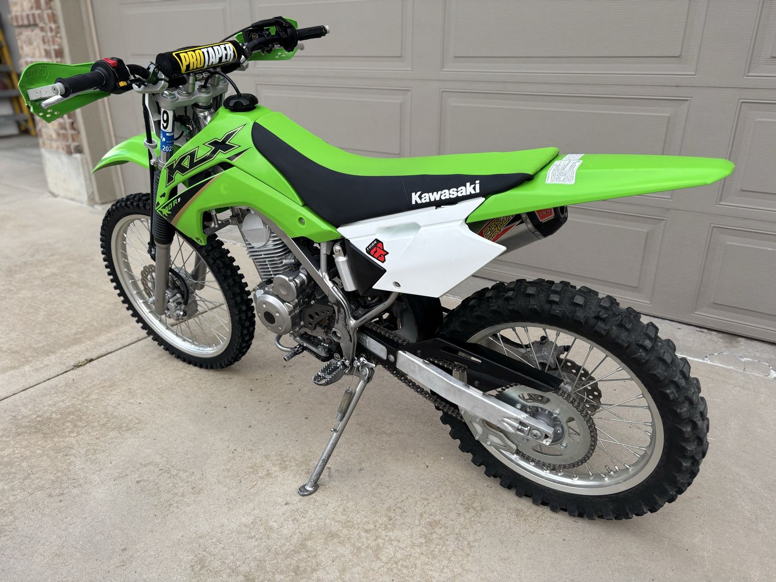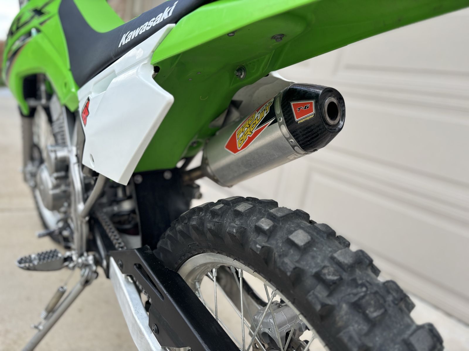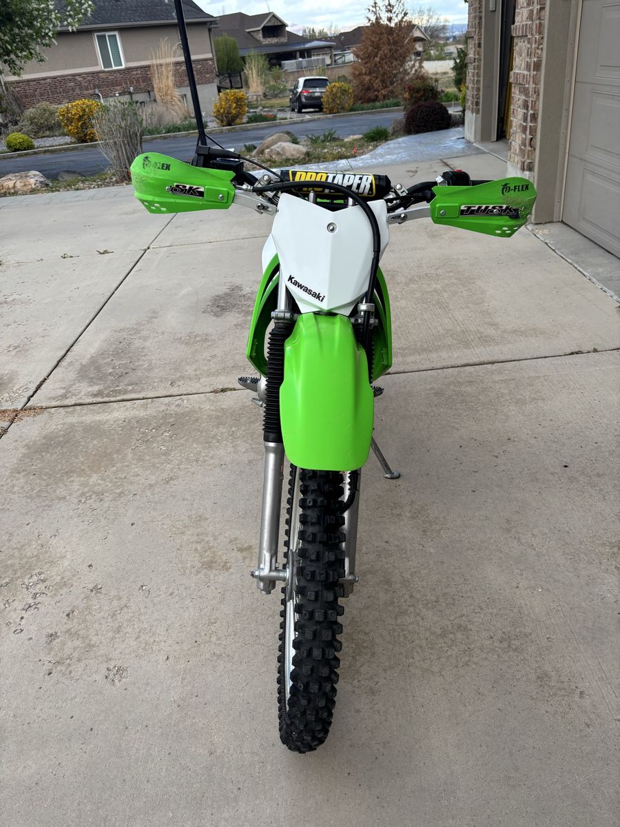 Great bike, kids have just outgrown it. This is the big bike version with 21” front tire and 18” rear tire. Has upgraded Pro Taper handlebars, tusk hand guards, and $400 upgraded Pro Circuit complete exhaust system. The exhaust makes it a little louder than stock and more power. It has a brand new battery. Been well maintained with regular oil changes and clean air filters. I have extra air filter and oil filters for it as well as a brand new shifter.