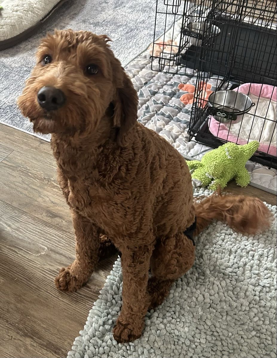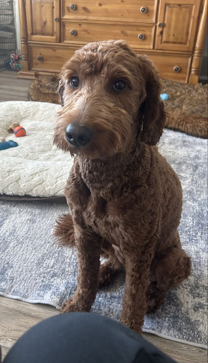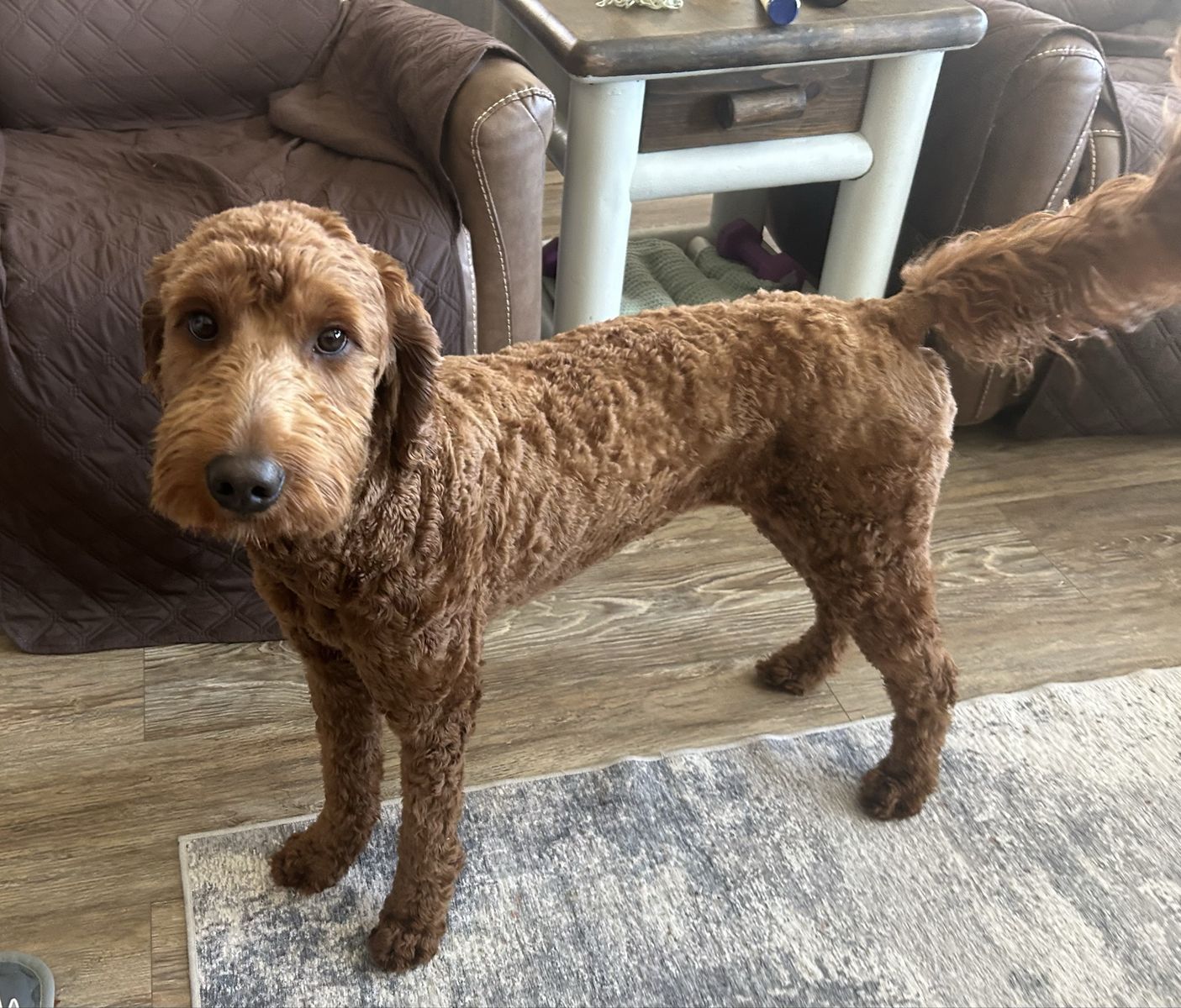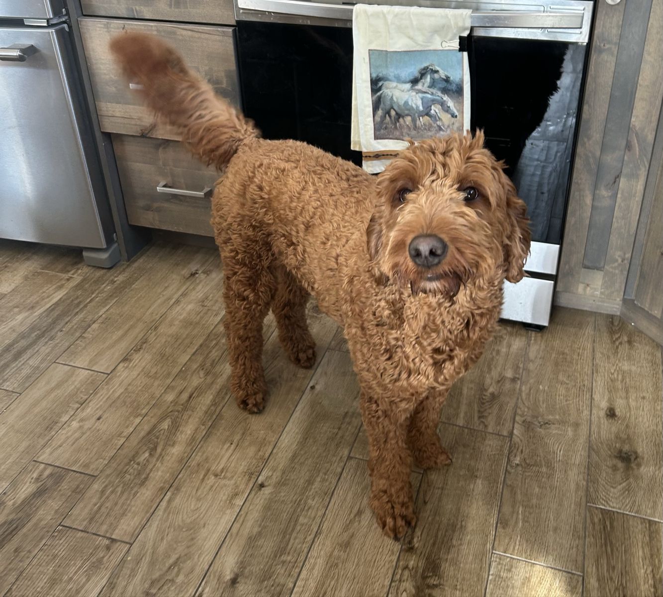 ZelleMocha is a one year old female standard Goldendoodle. She is a beautiful deep red. Weighs 50 lbs 25” tall. She is potty trained, crate trained, loves to go in the car. She loves walks and hiking. Great with kids. She can be shy around adults when she first meets them but warms up quickly. She loves attention. She has been dna health tested. She is an F1. Does not shed. Spay contract or breeding rights additional to an approved program