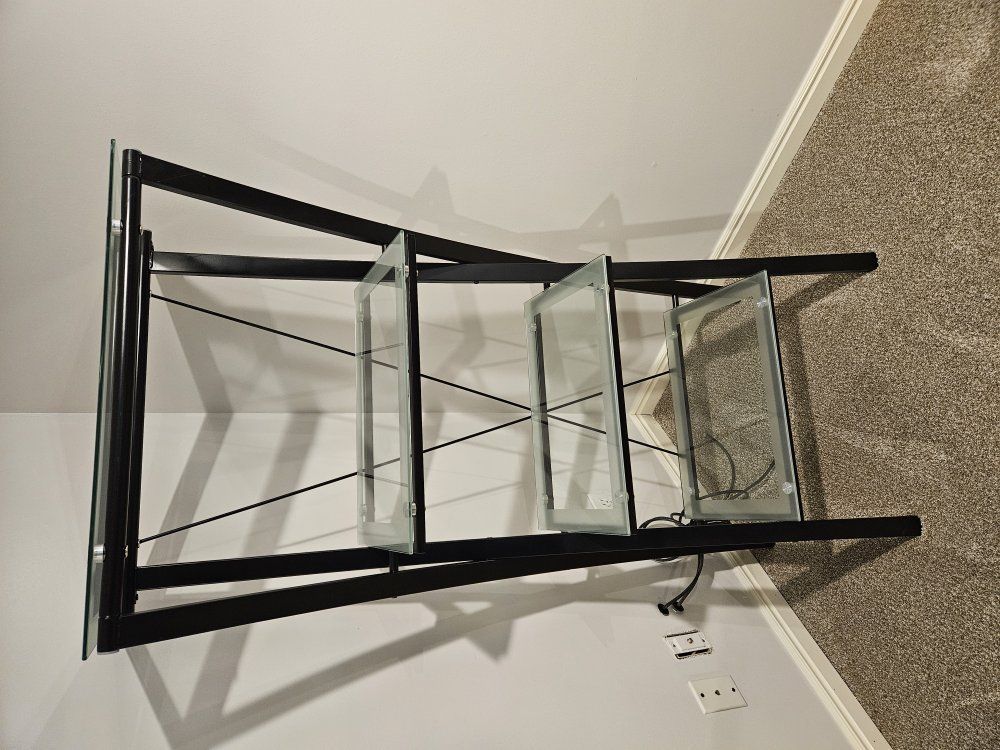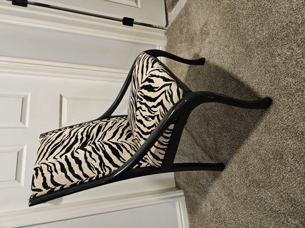 Glass and black metal desk and bookshelf, zebra print chair.