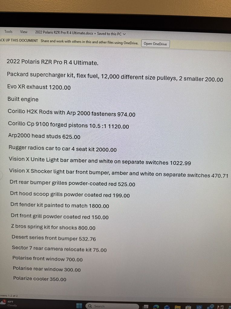 2022 Pro R Ultimate 4 seat Building a house need to sale Great machine built to be reliable. Built Motor with one ride. 897 miles Tuned buy Works Powersports 375 on dyno to rear wheels at 14.5lbs boost External boost controller adjustable on fly dash mounted with gauge AFR gauge dash mounted. To may extras to list here so extra list is in pictures. 50,000 OBO OPEN TO OFFERS.