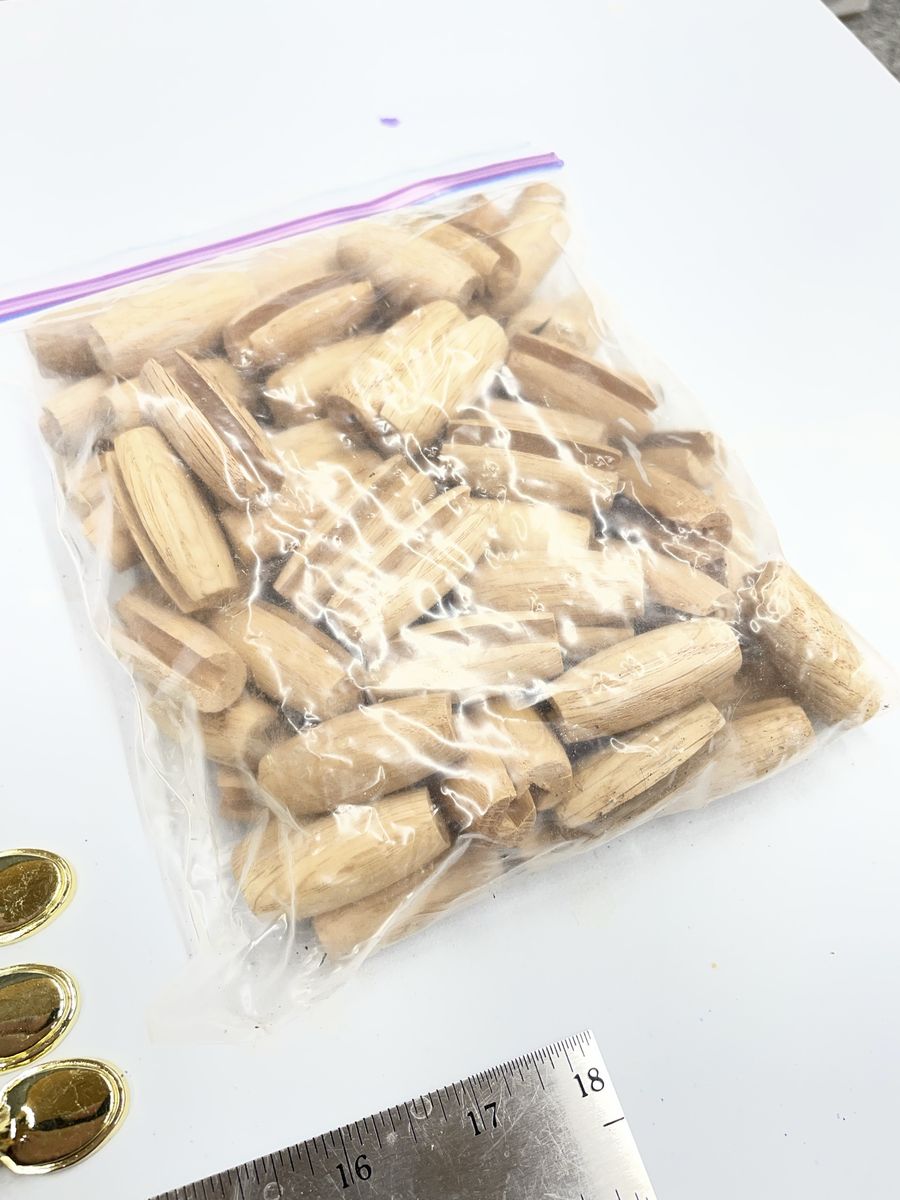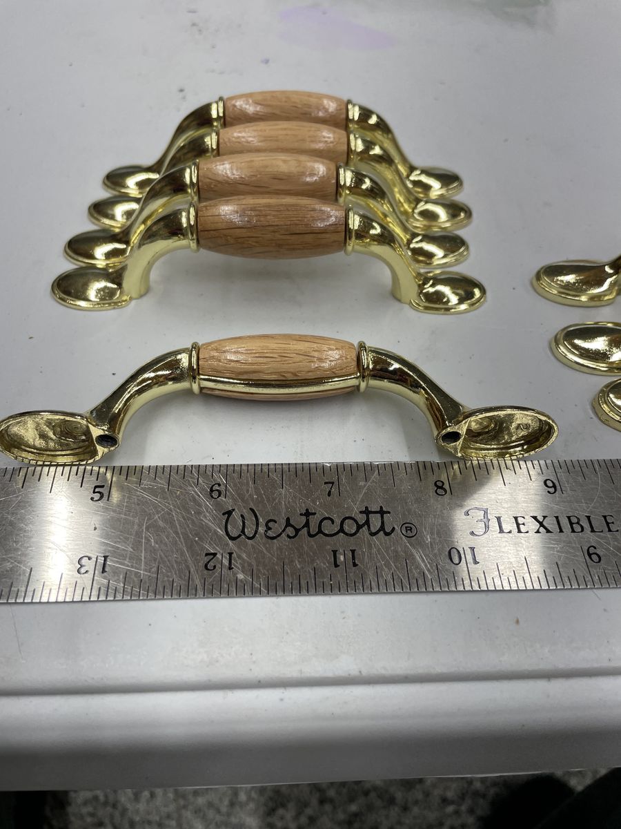 Brass and oak pulls I have 8 pulls the oak wood part can be taken off and I have new oak parts that can be finished to any color you wish or if you have broken ones you need to match either way I can help you with what you need if add is up then I have them no need to ask I also have many other pulls and knobs of many styles and colors so hinges of all kinds everything I have is new not used