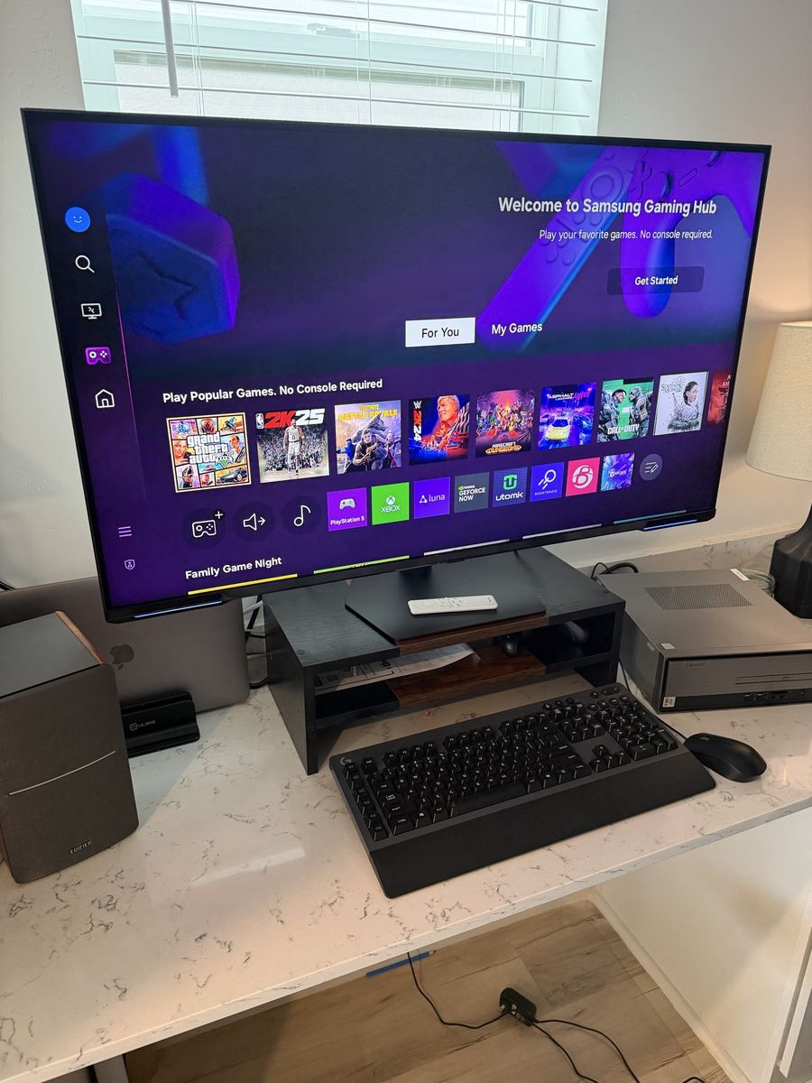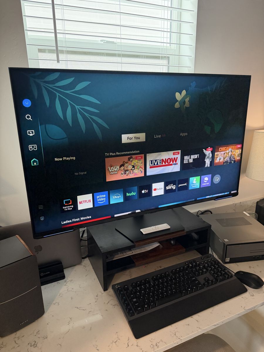 Highlights QUANTUM MATRIX TECHNOLOGY: Quantum Matrix Technology w/ Quantum Mini LEDs create controlled brightness and impressive contrast for games to come to life; Plus, advanced 12-bit back light unit allows detailed HDR control for unmatched picture quality*.Power Supply Type : AC100-240V 50/60Hz. Power Cable Length : 1.5 m VESA DISPLAY HDR600: Experience a new level of multi-entertainment with life-like visuals; With 1,000,000:1 contrast ratio and VESA Display HDR600, both videos and games deliver abundant, deeper blacks and greater color detailSync Premium Pro SMART TV EXPERIENCE: Enjoy your favorite shows and movies through the Smart TV apps; Take a break from marathon gaming sessions and catch up on must-see streaming content with just a simple Wi-Fi connection SAMSUNG GAMING HUB: The best of gaming all in one place; Samsung Gaming Hub allows instant access to top cloud gaming services and your favorite consoles; Smooth visuals and responsive gameplay are powered by advanced game streaming technology Description Explore the 4K UHD Odyssey Neo G7 gaming monitor with 1ms MPRT response time (MPRT), Quantum Mini LED, and VESA Display HDR600. Experience a versatile screen for both games and streaming videos. With a size of 43", the G7 is the perfect entertainment screen that has an ideal design for both console and PC games Features: QUANTUM MATRIX TECHNOLOGY Quantum Matrix Technology w/ Quantum Mini LEDs create controlled brightness and impressive contrast for games to come to life; Plus, advanced 12-bit back light unit allows detailed HDR control for unmatched picture quality.Power Supply Type : AC100-240V 50/60Hz. Power Cable Length : 1.5 m VESA DISPLAY HDR600 Experience a new level of multi-entertainment with life-like visuals; With 1,000,000:1 contrast ratio and VESA Display HDR600, both videos and games deliver abundant, deeper blacks and greater color detailSync Premium Pro SMART TV EXPERIENCE Enjoy your favorite shows and movies through the Smart TV apps; Take a break from marathon gaming sessions and catch up on must-see streaming content with just a simple Wi-Fi connection SAMSUNG GAMING HUB The best of gaming all in one place; Samsung Gaming Hub allows instant access to top cloud gaming services and your favorite consoles; Smooth visuals and responsive gameplay are powered by advanced game streaming technology 4K GAMING REFRESH RATES 144Hz refresh rate eliminates lag for gameplay with ultra-smooth action; Identify enemies with elite precision with a 1ms(MPRT) response time , precise mouse movements, and blur-free frames with minimized ghosting AMD FREESYNC PREMIUM PRO Effortlessly smooth gameplay; AMD FreeSync Premium Pro features adaptive sync technology which reduces screen tearing, stutter, and input latency; Low frame rate compensation ensures every scene flows seamlessly MATTE DISPLAY Focus only on what matters; The matte display absorbs, but does not reflect, artificial and natural light, minimizing glare and keeping you immersed during the toughest battles and hardest levels FLEX MOVE SCREEN Optimize your gaming setup for boosted performance with Flex Move Screen by adjusting the on-screen size from 43 to 20 inches so you can maintain a winning position ULTRAWIDE GAME VIEW Extend the screen and uncover unseen areas of game worlds with the Ultrawide Game View feature; Expand the aspect ratio easily from 16:9 to 21:9 to gain a competitive edge GAME BAR Easily view the status of the most important settings such as FPS or HDR; Modify response time or screen ratio, as well as the game picture mode, without having to leave your game screen to keep you focused on your goal Samsung 43″ Odyssey Neo G7 (Model: LS43CG702NNXZA) Screen Size: 43" (16:9) Resolution: 3840 ×