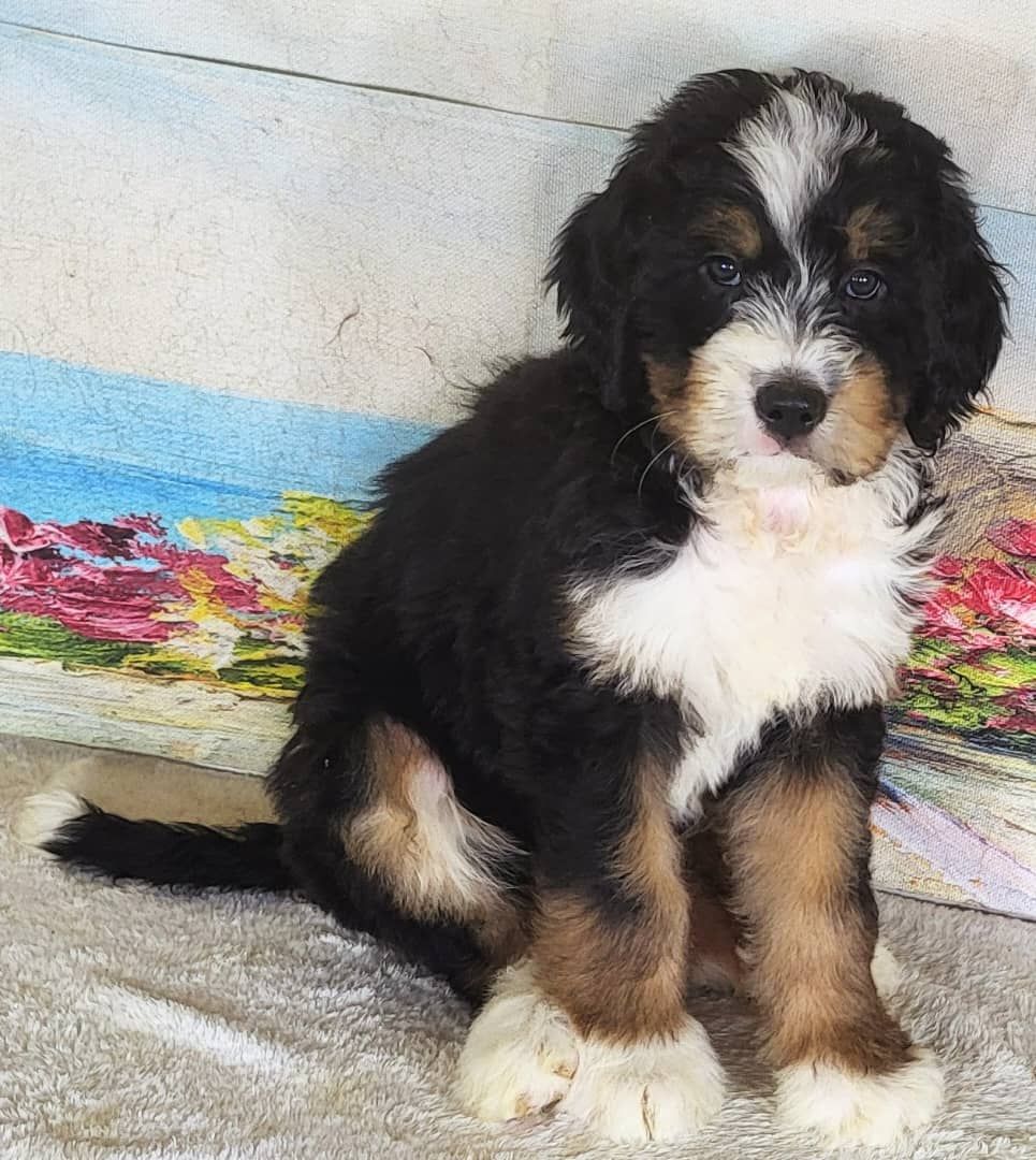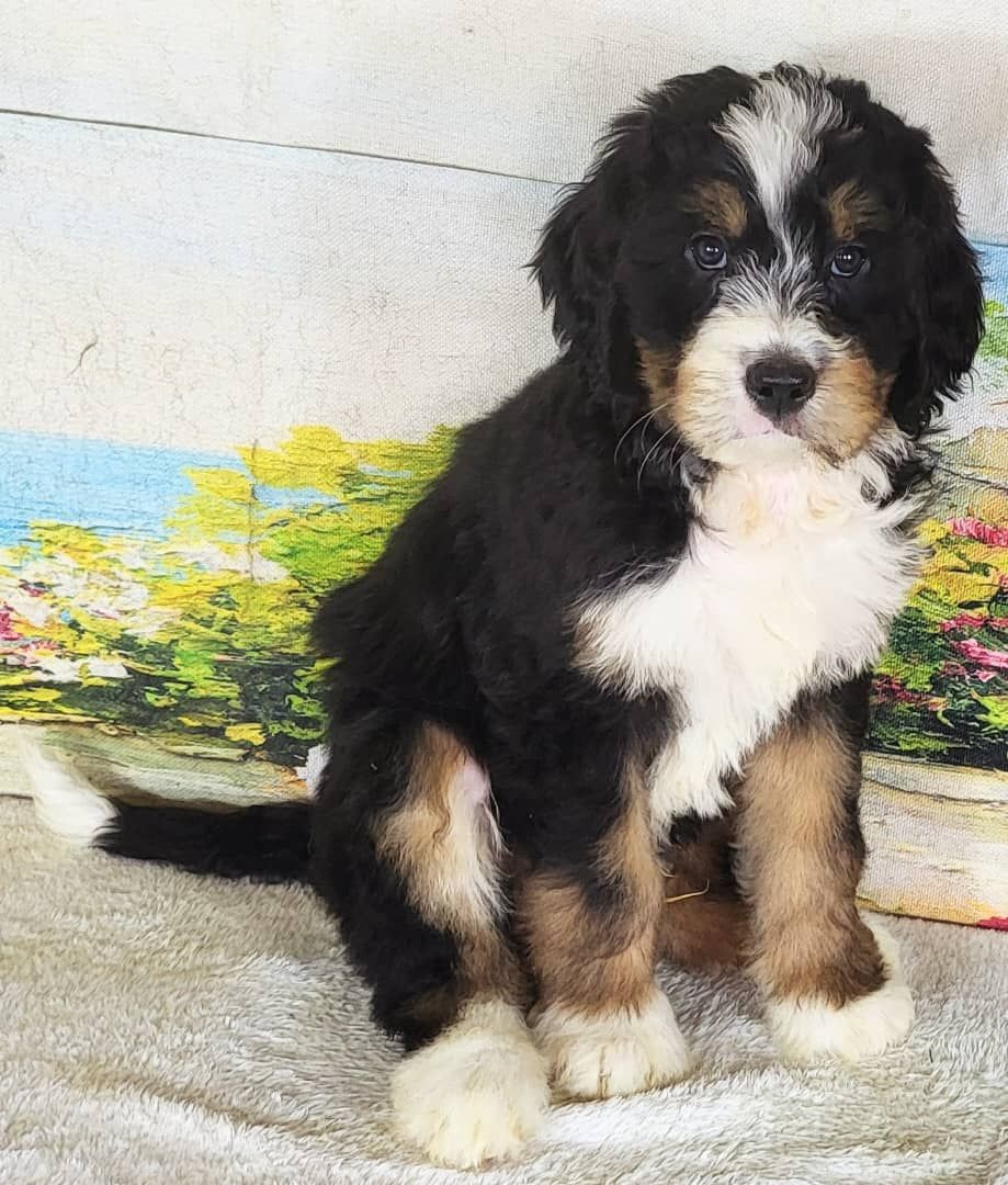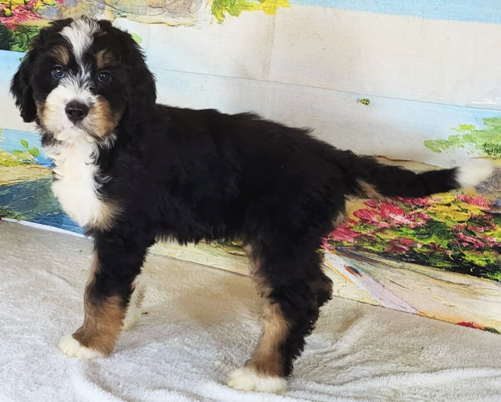 ZelleMeet Finn, a handsome Standard Bernedoodle with a lovable personality and a great family-friendly temperament! He’s expected to be around 55–70 lbs full grown, making him a perfect larger companion for those looking for a loyal, cuddly best friend.