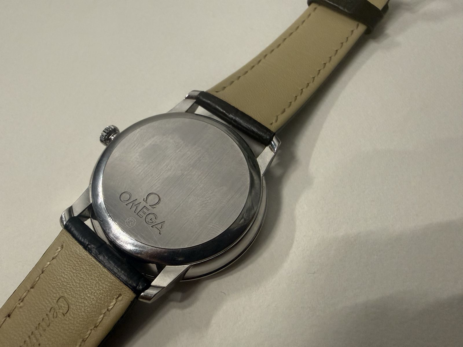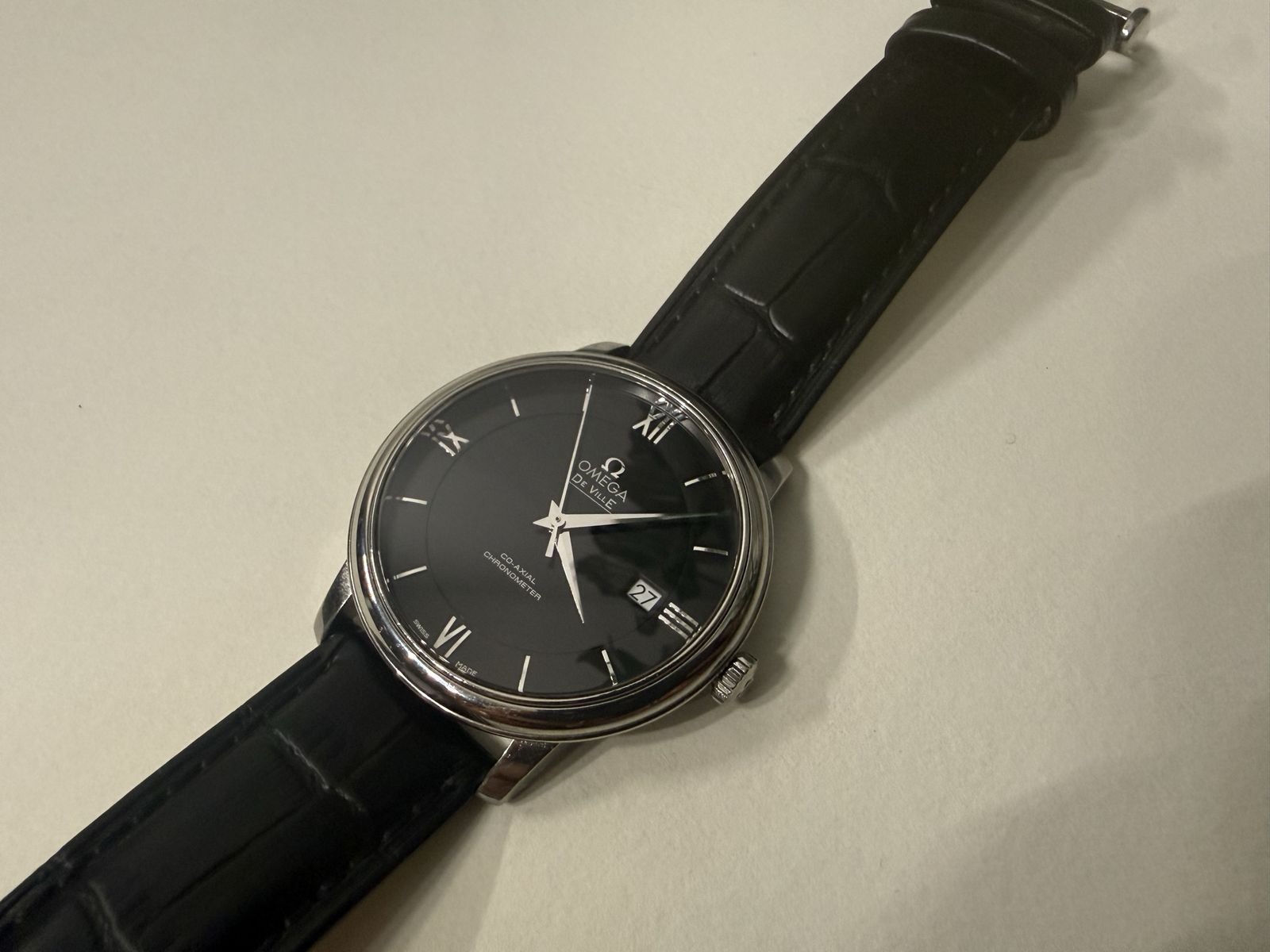 • Model: De Ville Prestige Co-Axial • Reference: 424.13.40.20.01.001 • Movement: Omega Calibre 2500D (The highly sought-after final "D" version of the Co-Axial movement) • Case Size: 39.5mm • Dial: Black with Date at 3 o'clock • Crystal: Domed, scratch-resistant sapphire crystal with anti-reflective treatment • Strap: High-quality aftermarket black leather alligator-grain strap (excellent condition)