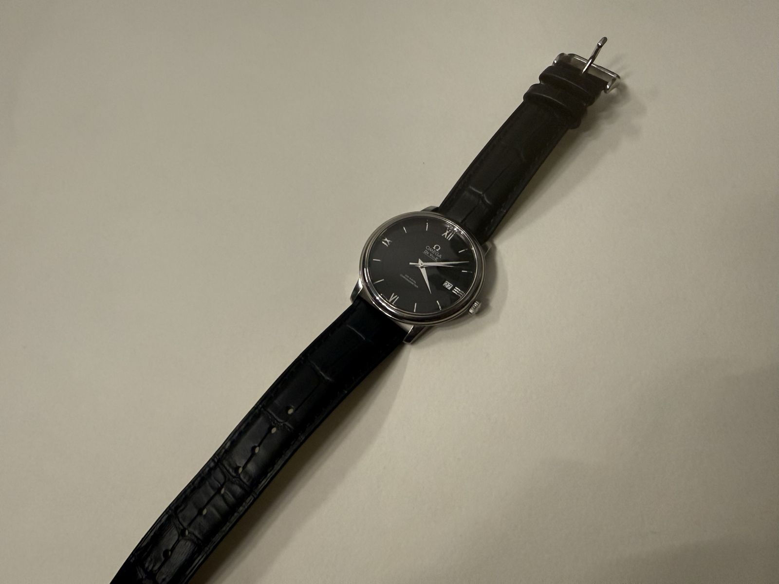 Up for sale is a beautiful Omega De Ville Prestige. This is the modern 39.5mm version, featuring a stunning sunray black dial with polished Roman numeral markers. It is the perfect blend of classic aesthetics and modern mechanical reliability.