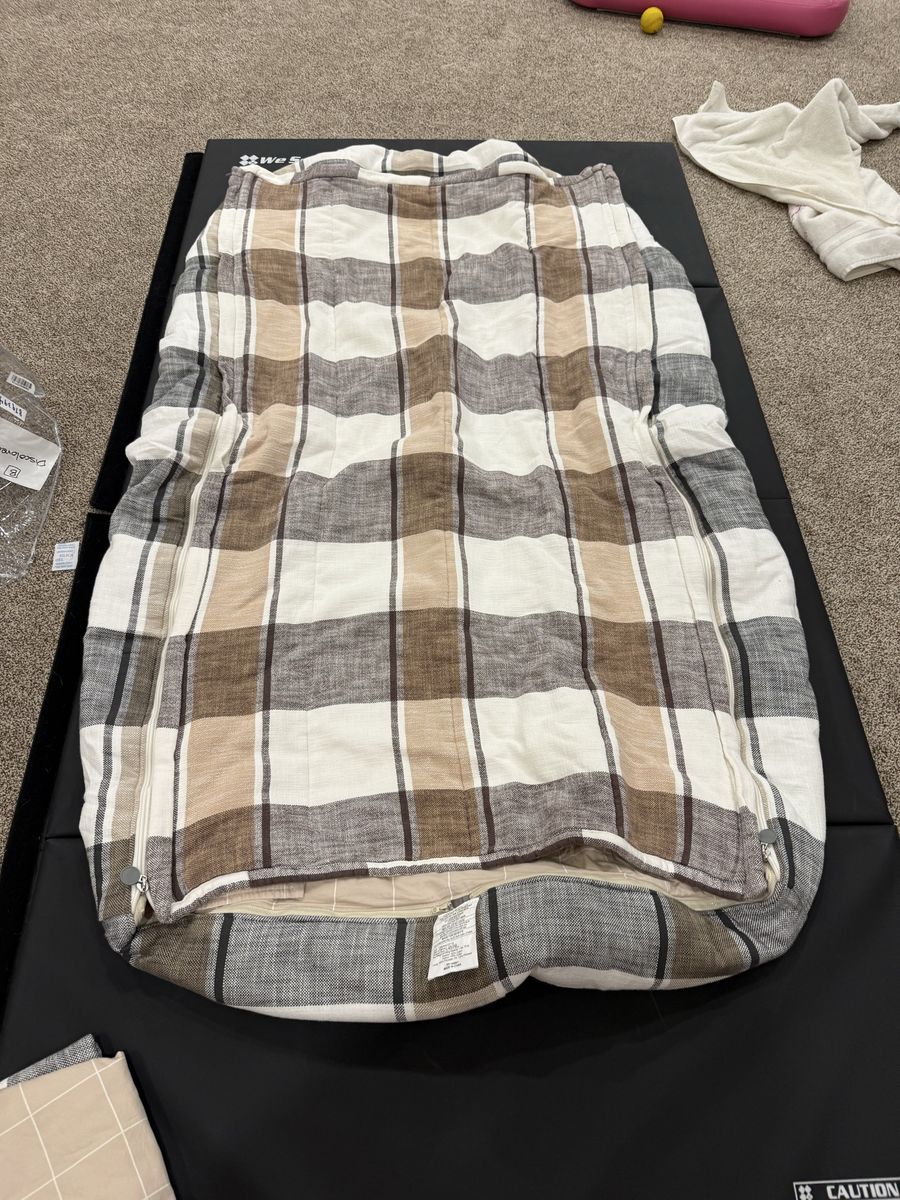 Has a sham and a case and 2 sheets. Top has some bleaching. Mar60