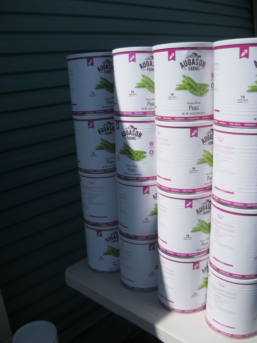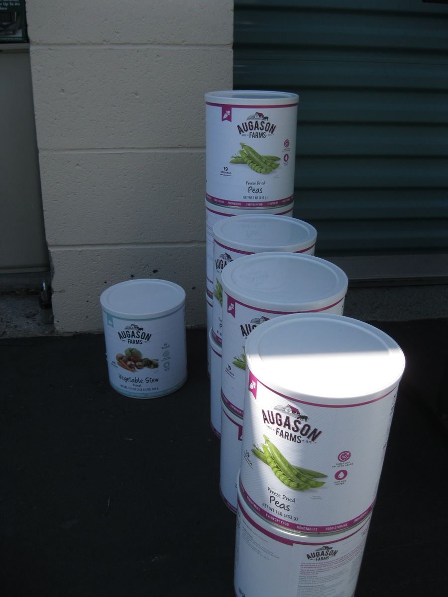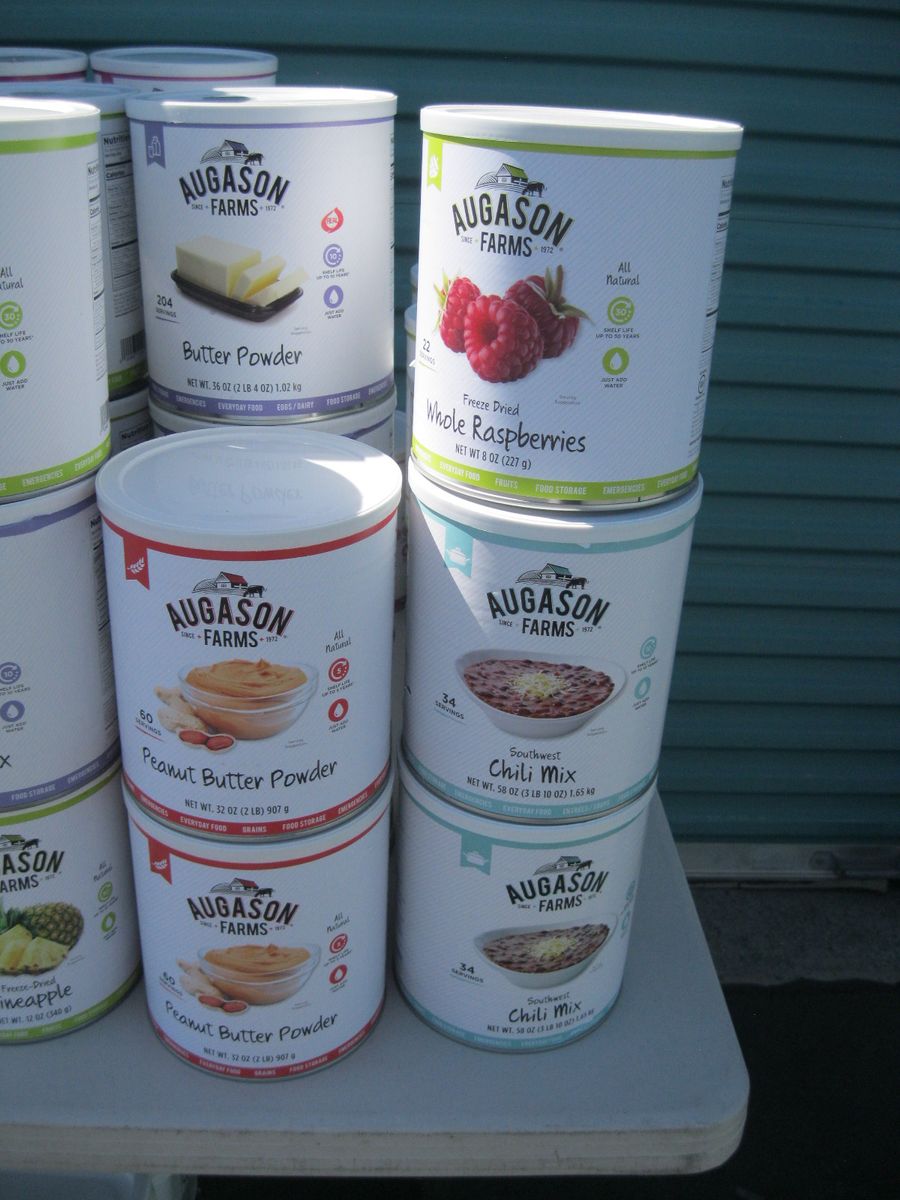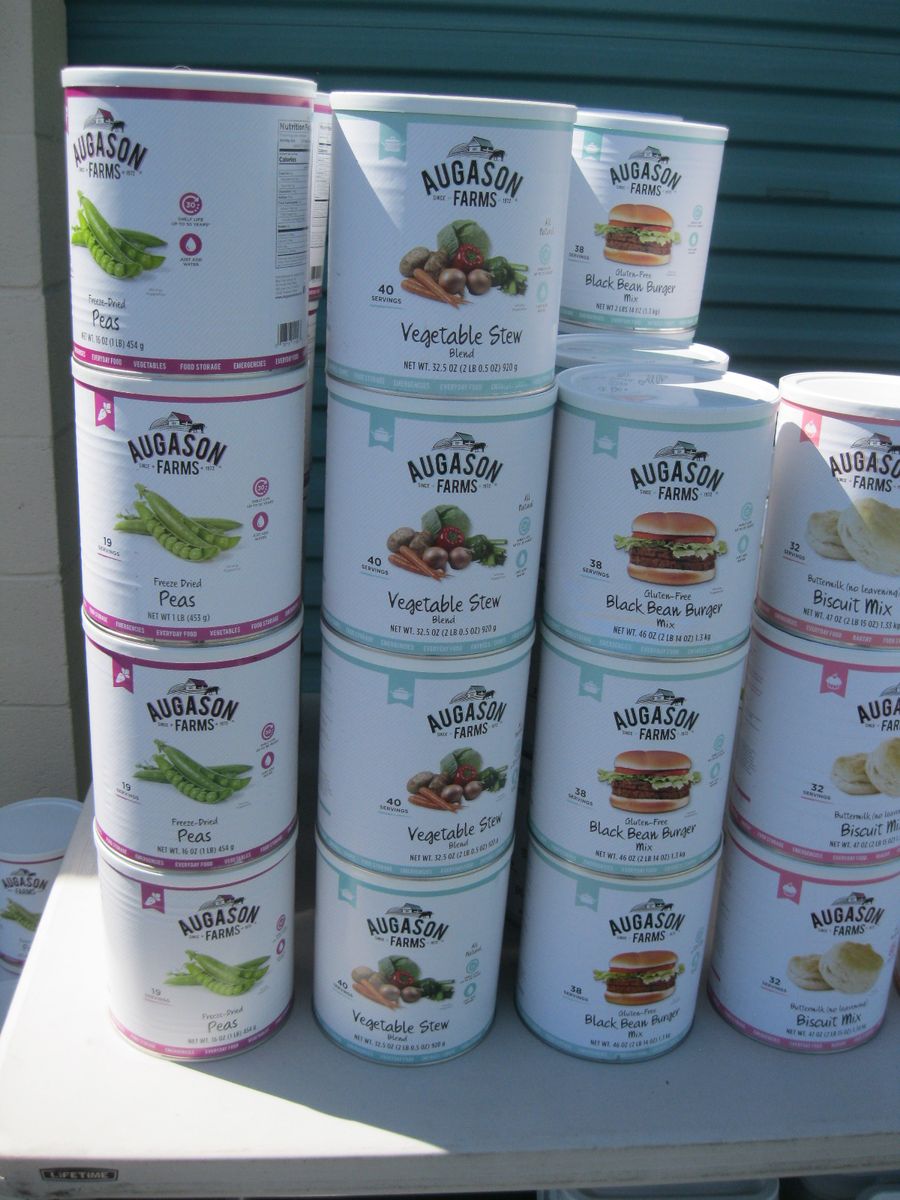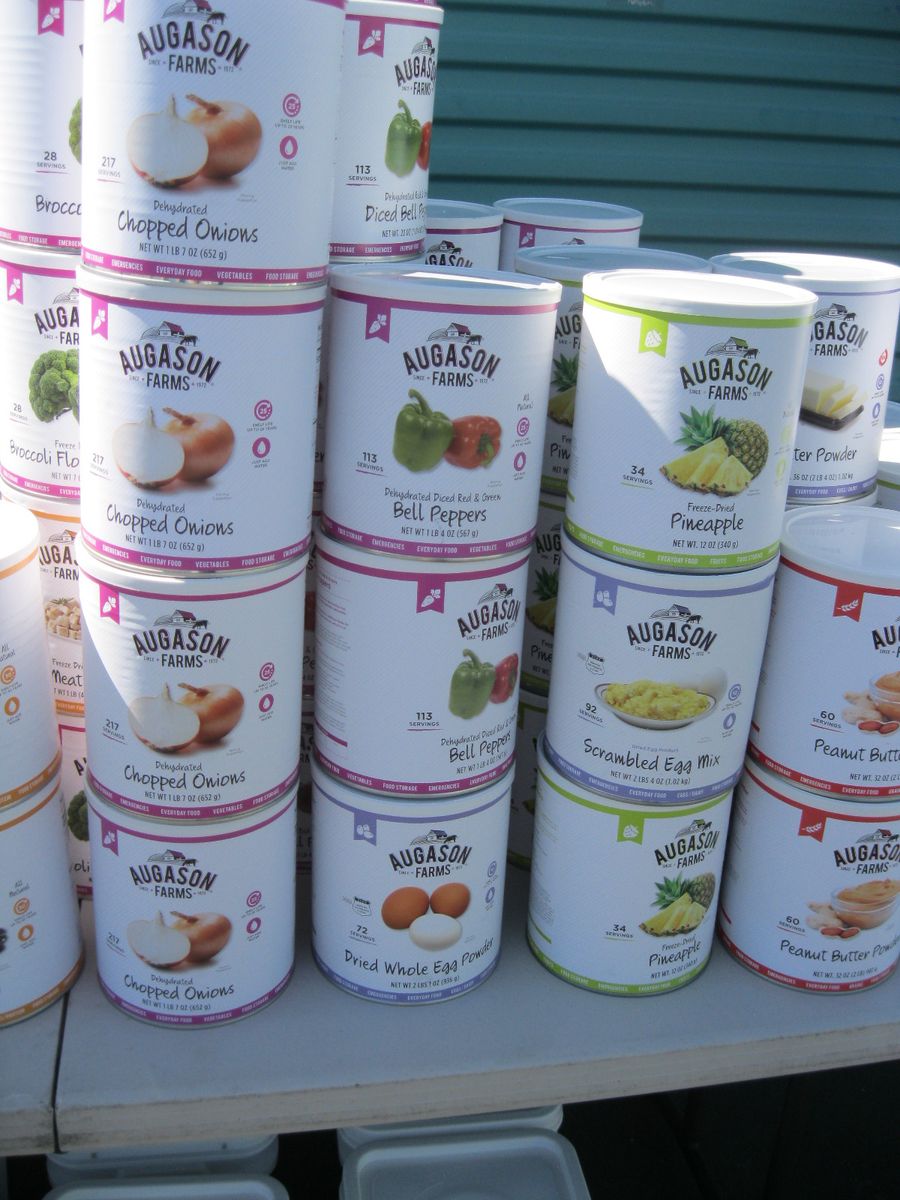 For sale is a lot of new unopened Augason Farms freeze dried foods storage that was packed in 2021-2022. There are 25 cans of peas, 17 cans Vegetable stew, 14 cans black bean burger, 3 cans buttermilk biscuit mix, 2 cans black beans, 4 cans whole blueberries, 3 cans broccoli florets and stems, 1 can white meat, 4 cans chopped onions, 1 can dried whole eggs, 1 can scrambled egg mix, 11 cans of bell peppers, 7 cans diced carrots, 3 cans peanut butter powder, 2 cans butter powder, 6 cans of pineapple, 2 cans southwest chili mix, 5 can banana chips, and 1 can whole raspberries. There are also buckets: 1 bucket of black bean burger mix, 2 buckets of banana chips, 3 buckets of brown rice, 2 buckets of lunch and dinner mix. The cost on this lot is around $3315 to replace it. Has been stored in a dark basement since new. $1000 or best offer.