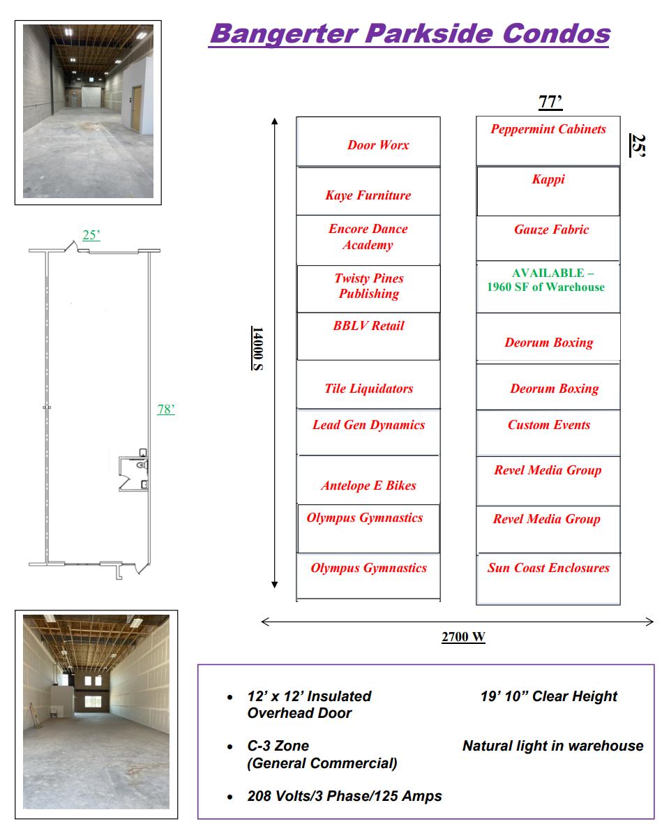 1960 SF of warehouse available for sublease April 1st, 2026. This unit was built in 2023 and has had one very clean user in it. It comes with an office quality restroom, heat, lights, outlets, a 12' x 12' overhead garage door, and two man doors. The rent is $3495 including the sublandlord paying all fees except electricity, gas, and internet. The project is in a great area in Bluffdale and supports many different uses. Call today to schedule a showing or for more info.