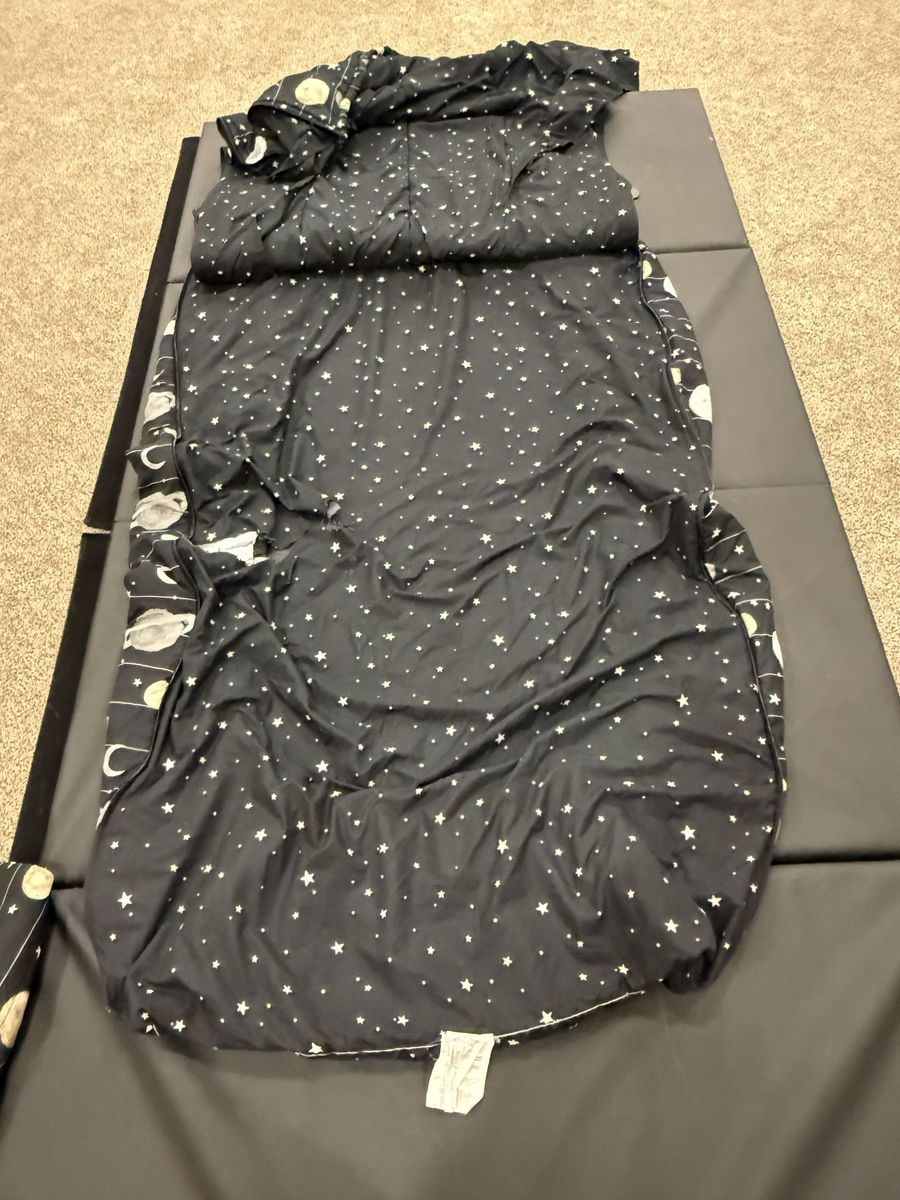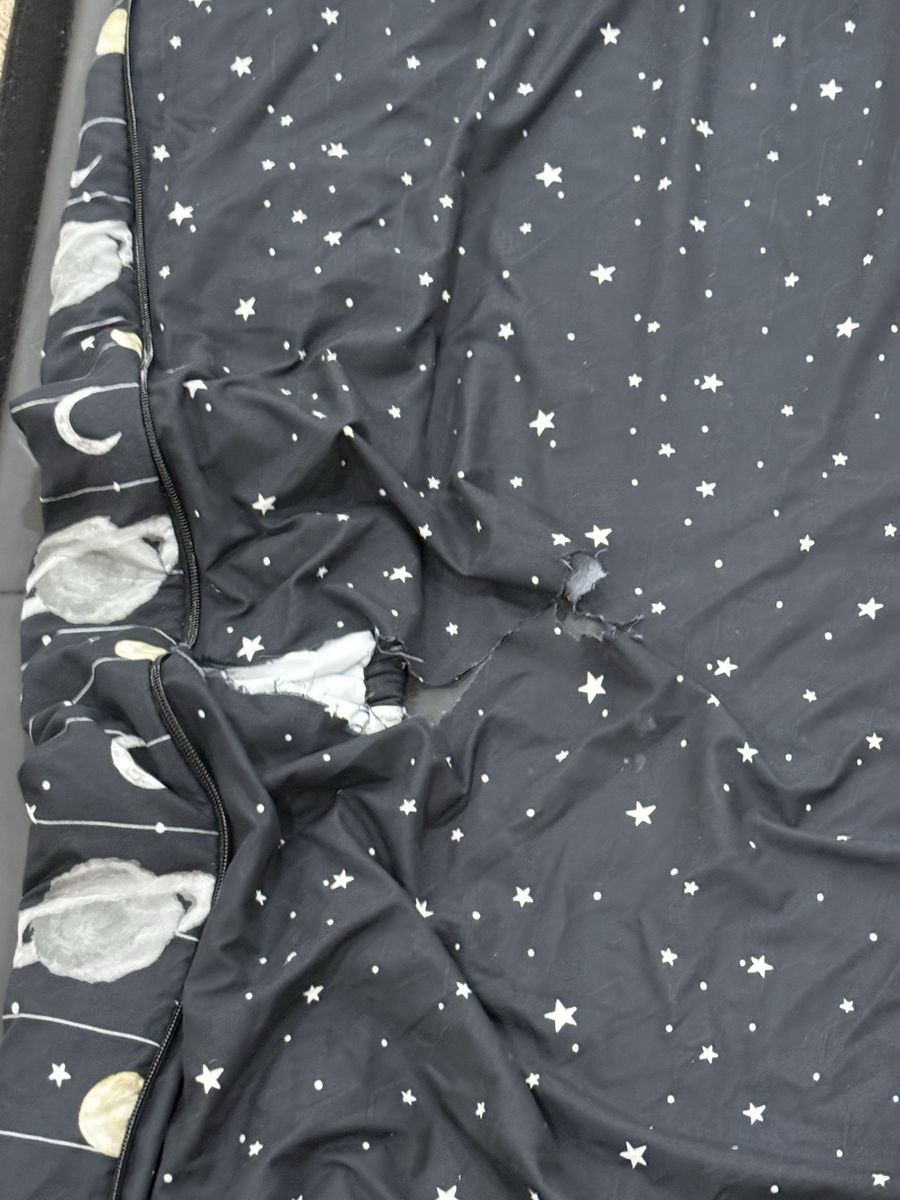 Has a sham and a case, large rip in sheet. Has a scratch mark in fabric on top. Mar62