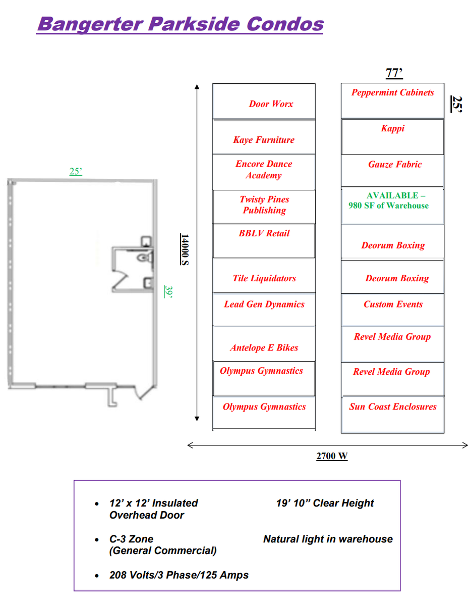 980 SF of warehouse available for sublease April 1st, 2026. This unit was built in 2023 and has had one very clean user in it. It comes with an office quality restroom, heat, lights, outlets, and one man door. Does not include an overhead garage door or any doc high doors. The rent is $1750 including the sublandlord paying all fees except electricity, gas, and internet. The project is in a great area in Bluffdale and supports many different uses. Call today to schedule a showing or for more info.