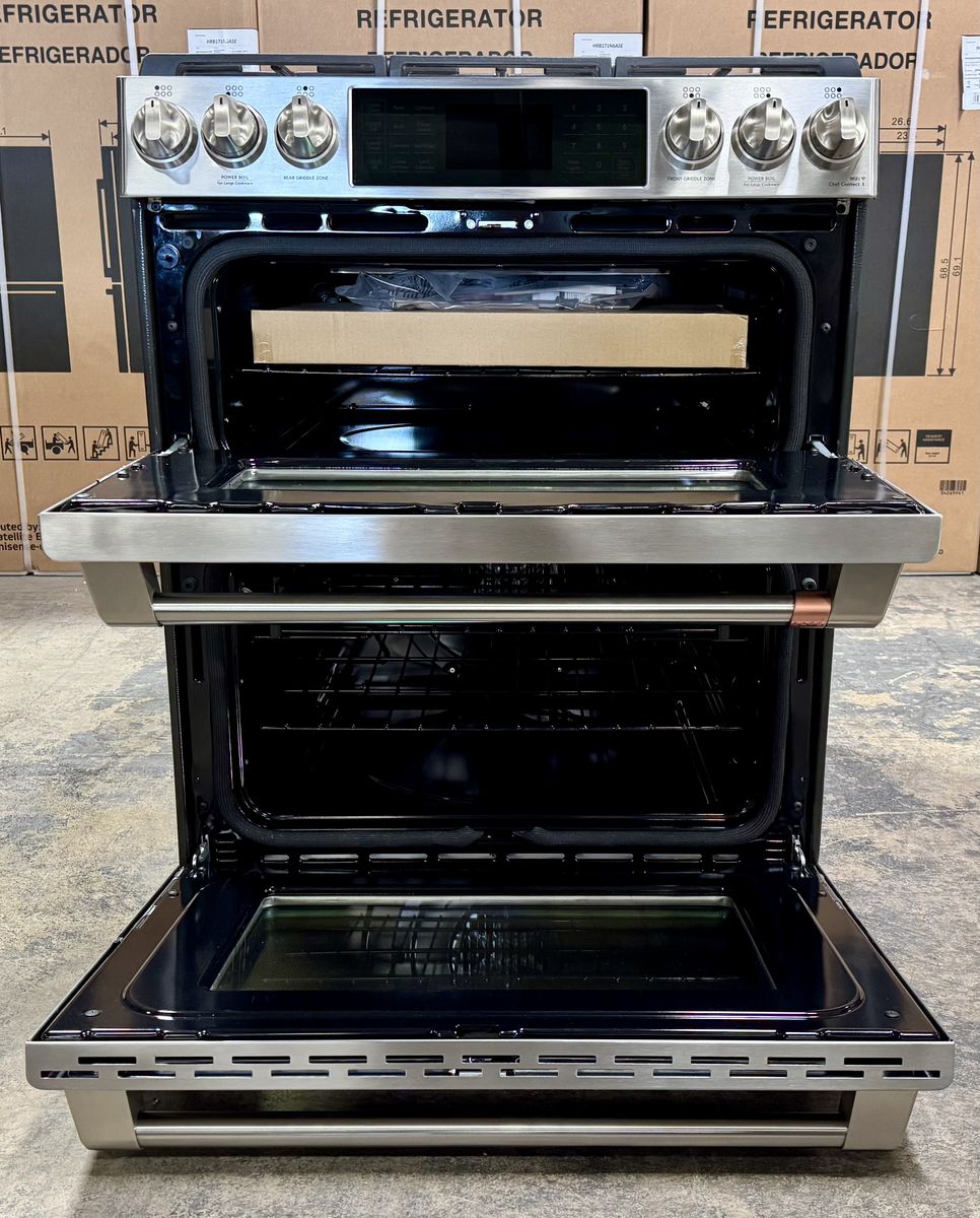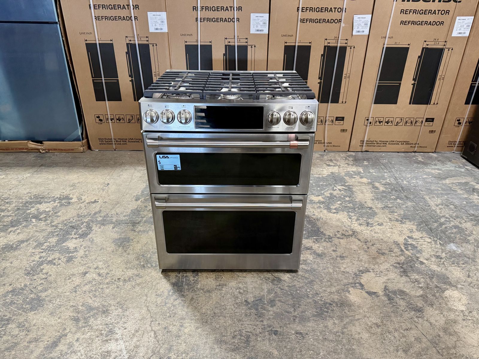 CAFE 30 Inch Slide-In Dual Fuel Smart Range with 6 Sealed Burners, Double Oven, 7.0 Cu. Ft. Total Oven Capacity, Continuous Grates, Self-Clean, Steam Clean Option, Sabbath Mode, 21K Tri-Ring Burner, CSA, and ADA Compliant: Stainless Steel