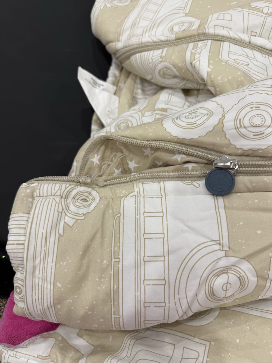 Has a sham. Zipper teeth broken left side if laying in bed at the very top, so 90% of the zipper still works on that side. Other side works. MAR64