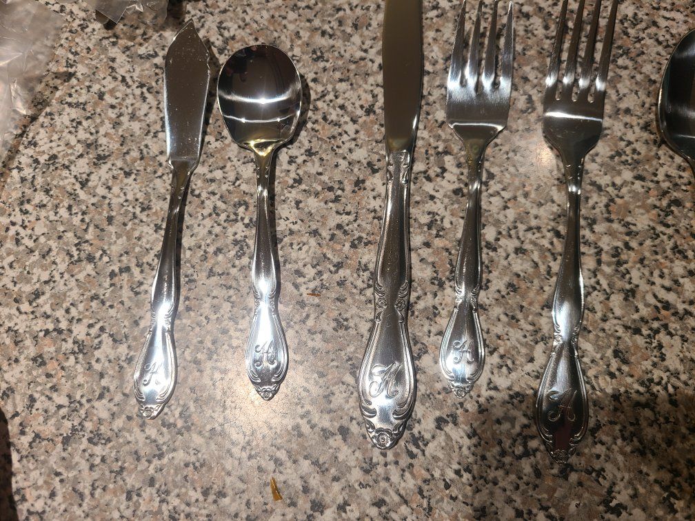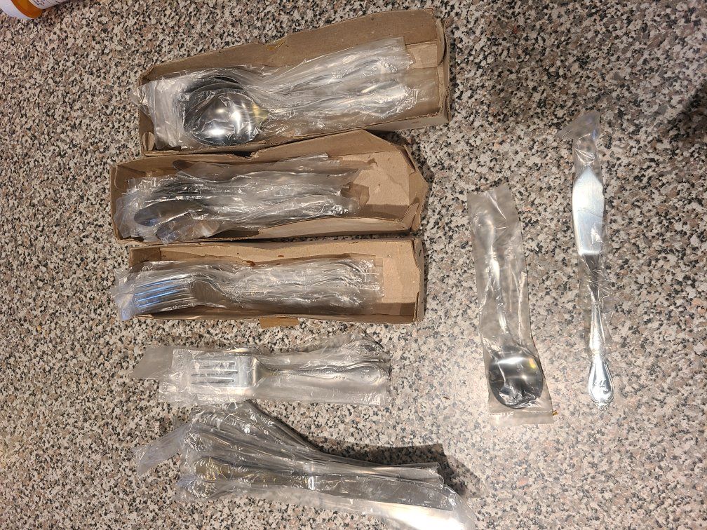 8 butter knives 1 spread knife 1 dish spoon 7 salad forks 16 small spoons 8 large spoons
