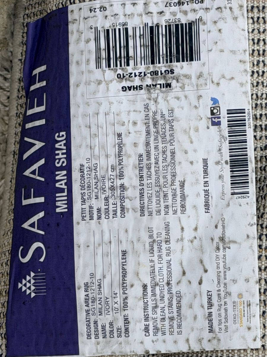 New 10x14 Safavieh Crean Shag. Dirty In Shipping. Just Needs The Corner Cleaned. Need It Gone! Big, Beautiful, And Need Gone ASAP. Priced To Move. Retails $800.