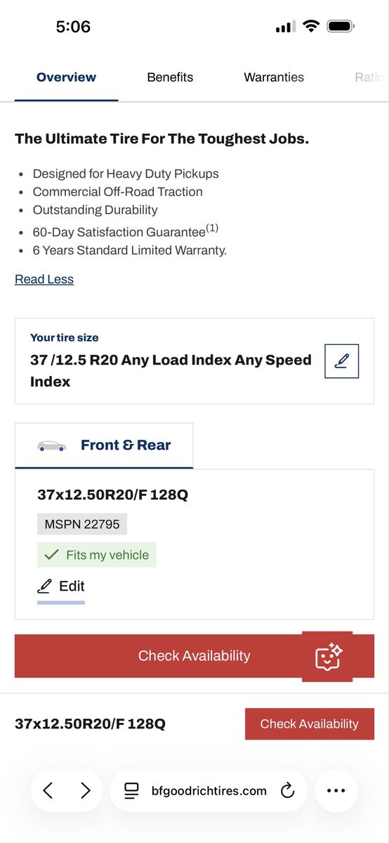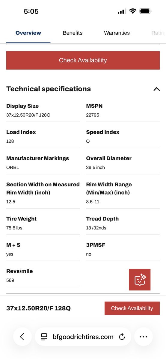 ApplePayLike new BFG HD-TERRAIN T/A tires. 37x12.5R20. Tires still have the wear knobs. No damage to beads, patches, or plugs. Please call or text with any questions.