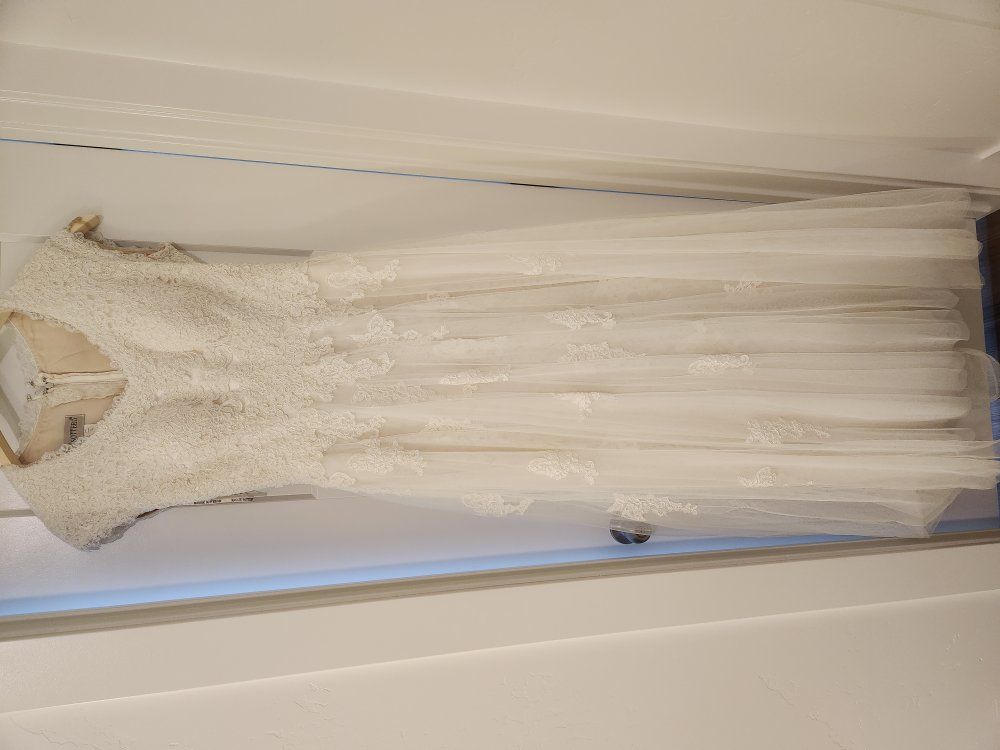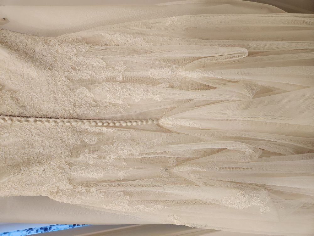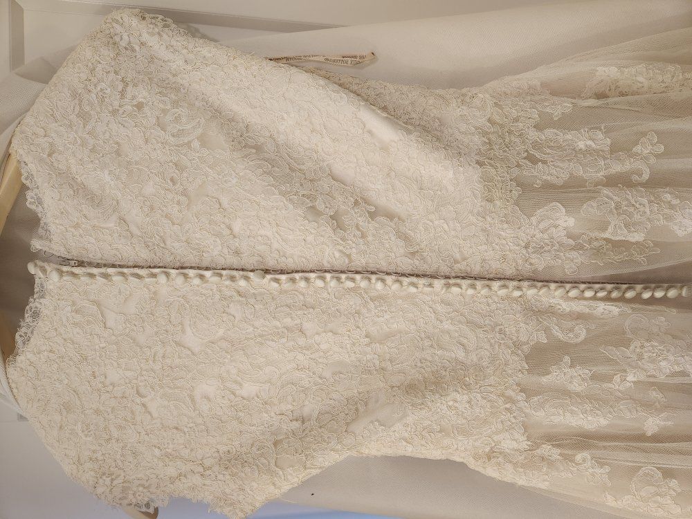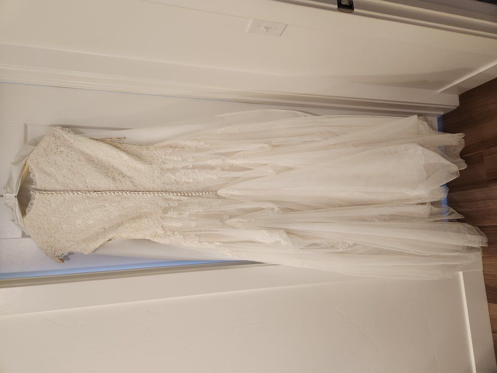 Beautiful lace wedding dress. Originally a size 13, but was altered to fit like a 10. I was 5'9" and ~175 lbs in the pictures for context.