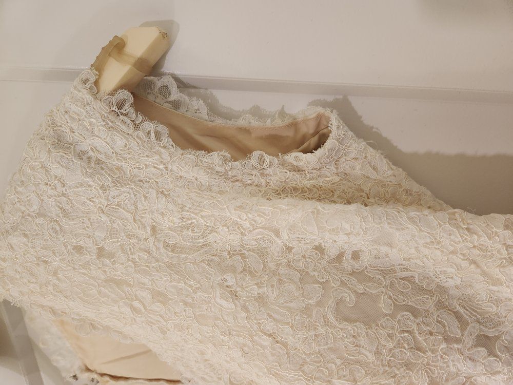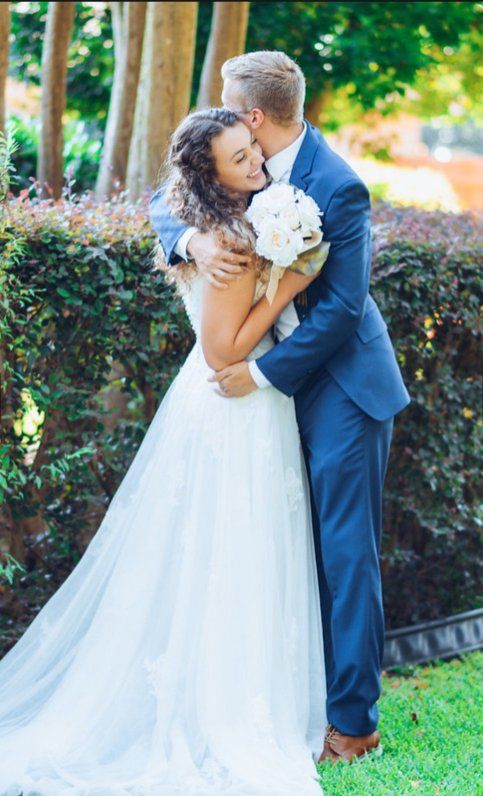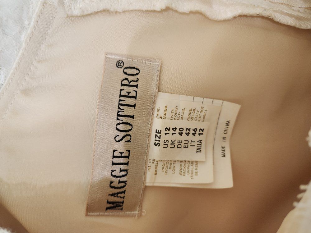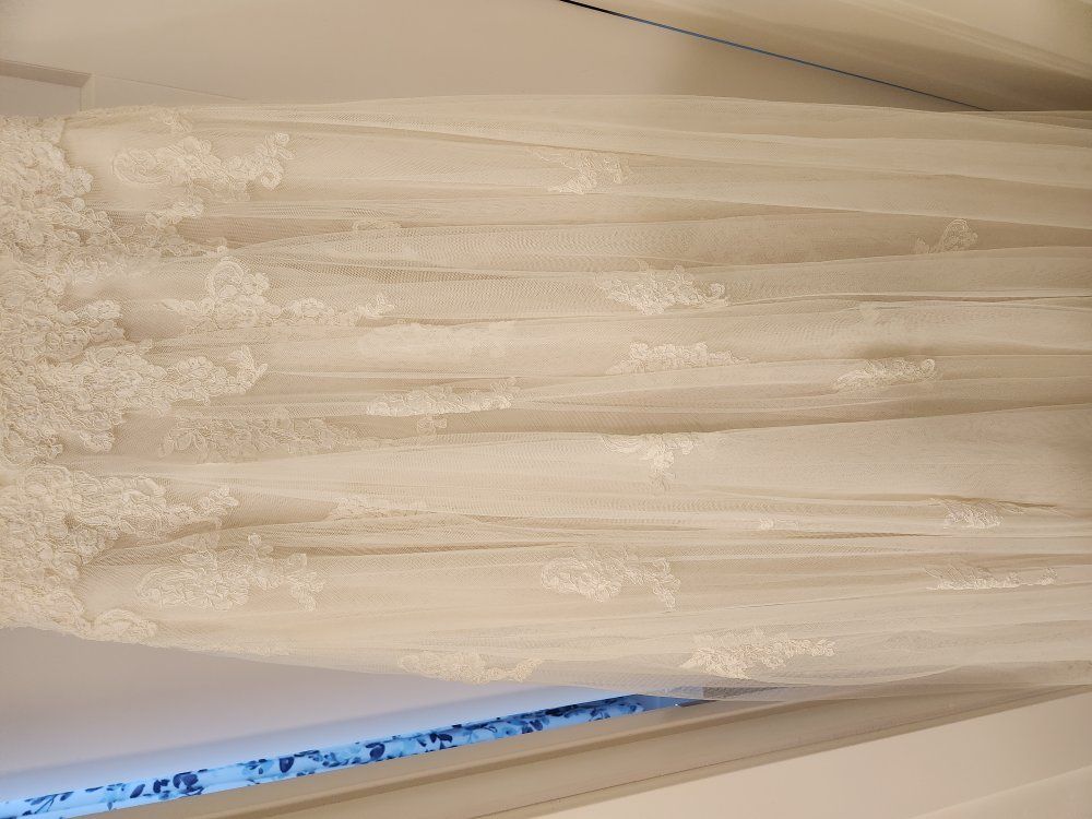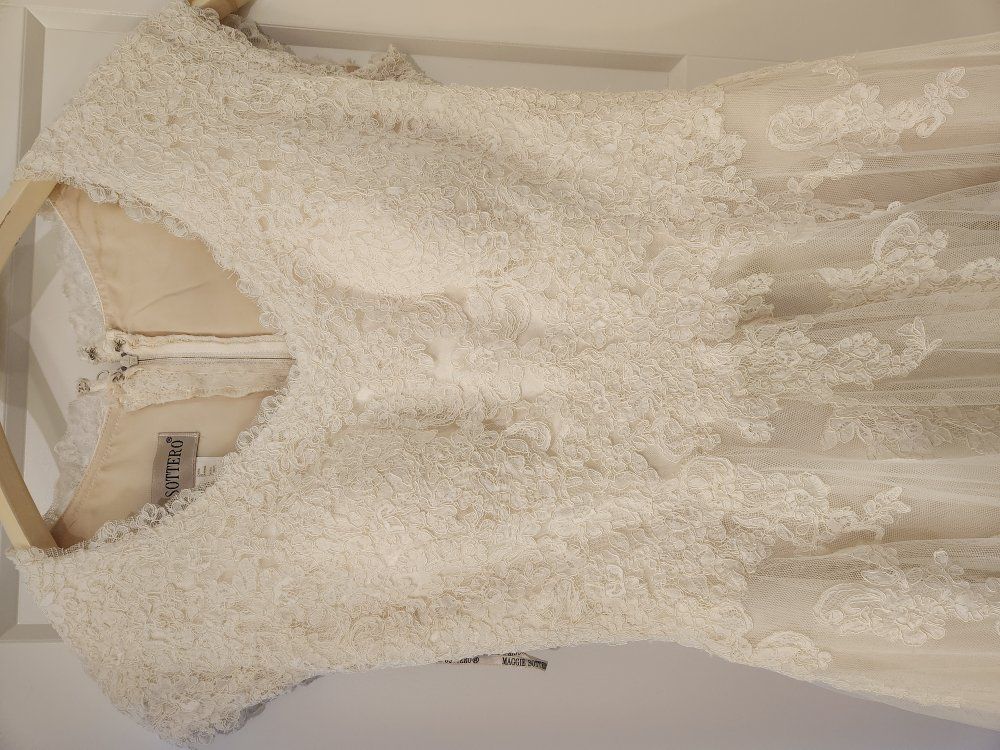 Beautiful lace wedding dress. Originally a size 13, but was altered to fit like a 10. I was 5'9" and ~175 lbs in the pictures for context.