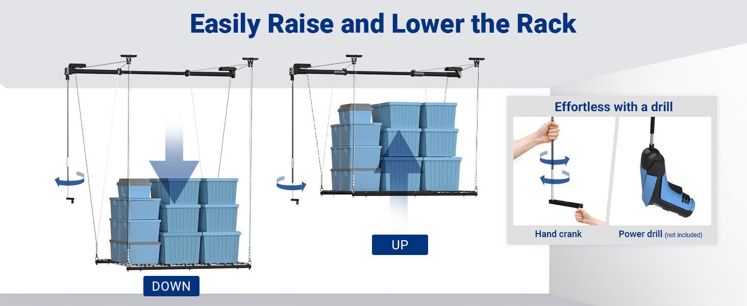 LIFTING DESIGN: hand crank or power drill (power drill not included)