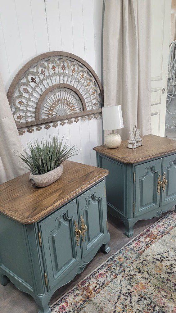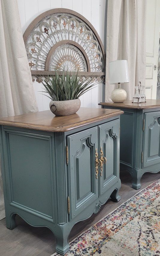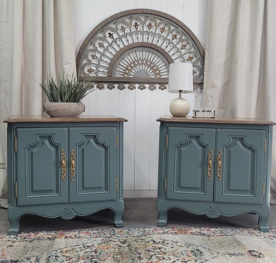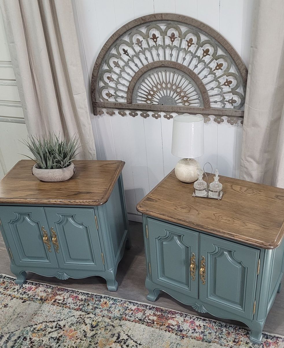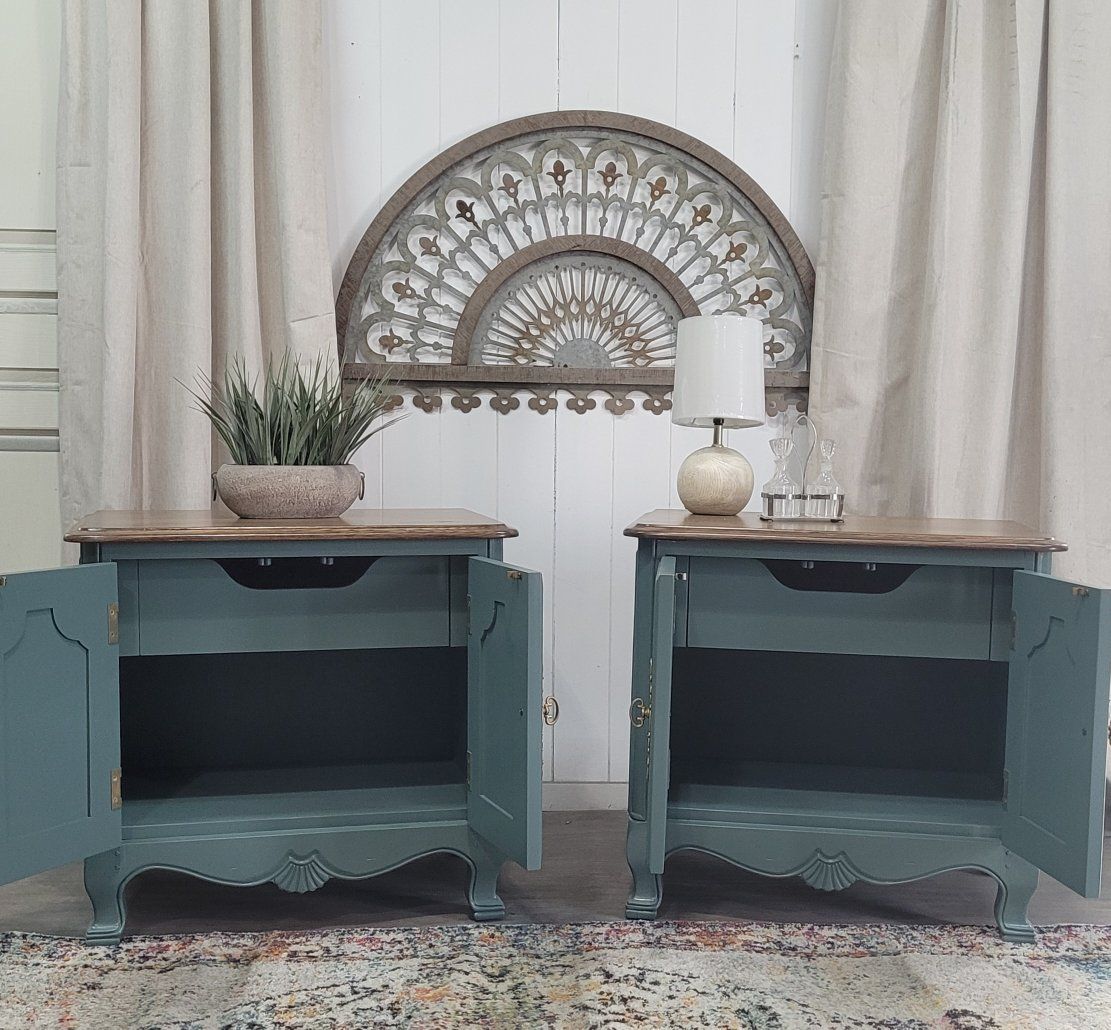 Vintage Drexel Heritage solid wood nightstand set. Finished in a gorgeous green with a medium stained top. Each nightstand has a drawer with open storage below, hidden behind the doors. Original hardware has gotten a nice metallic gold added. 26w x 17.5d x 25h