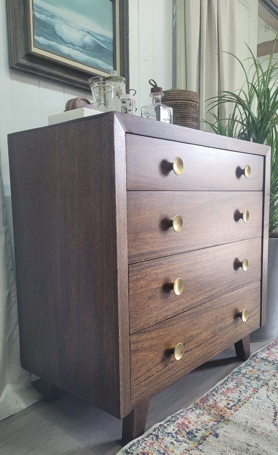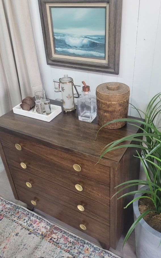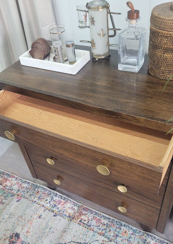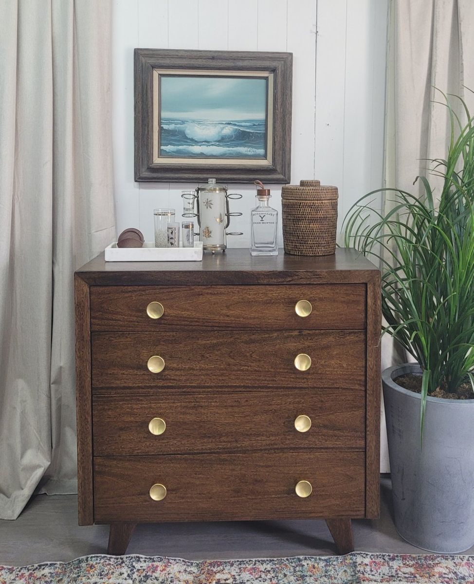 This vintage dresser appears to be a very well built piece by an individual. This is not a factory piece. I stripped the whole piece to raw wood and restained it in dark walnut. It has several coats of very durable lacquer. All of the hardware is original. This would make a great entry piece, a drink station or extra storage. 35.5w x 18d x 35h