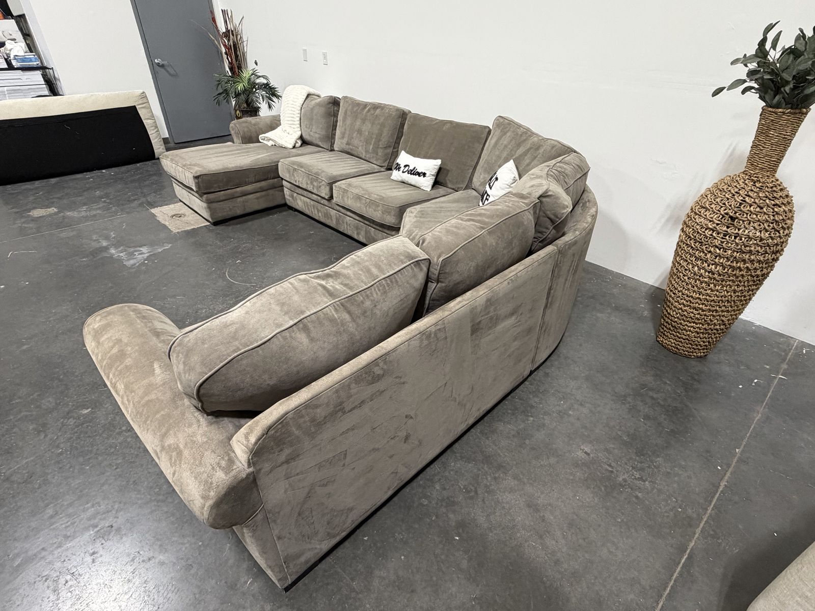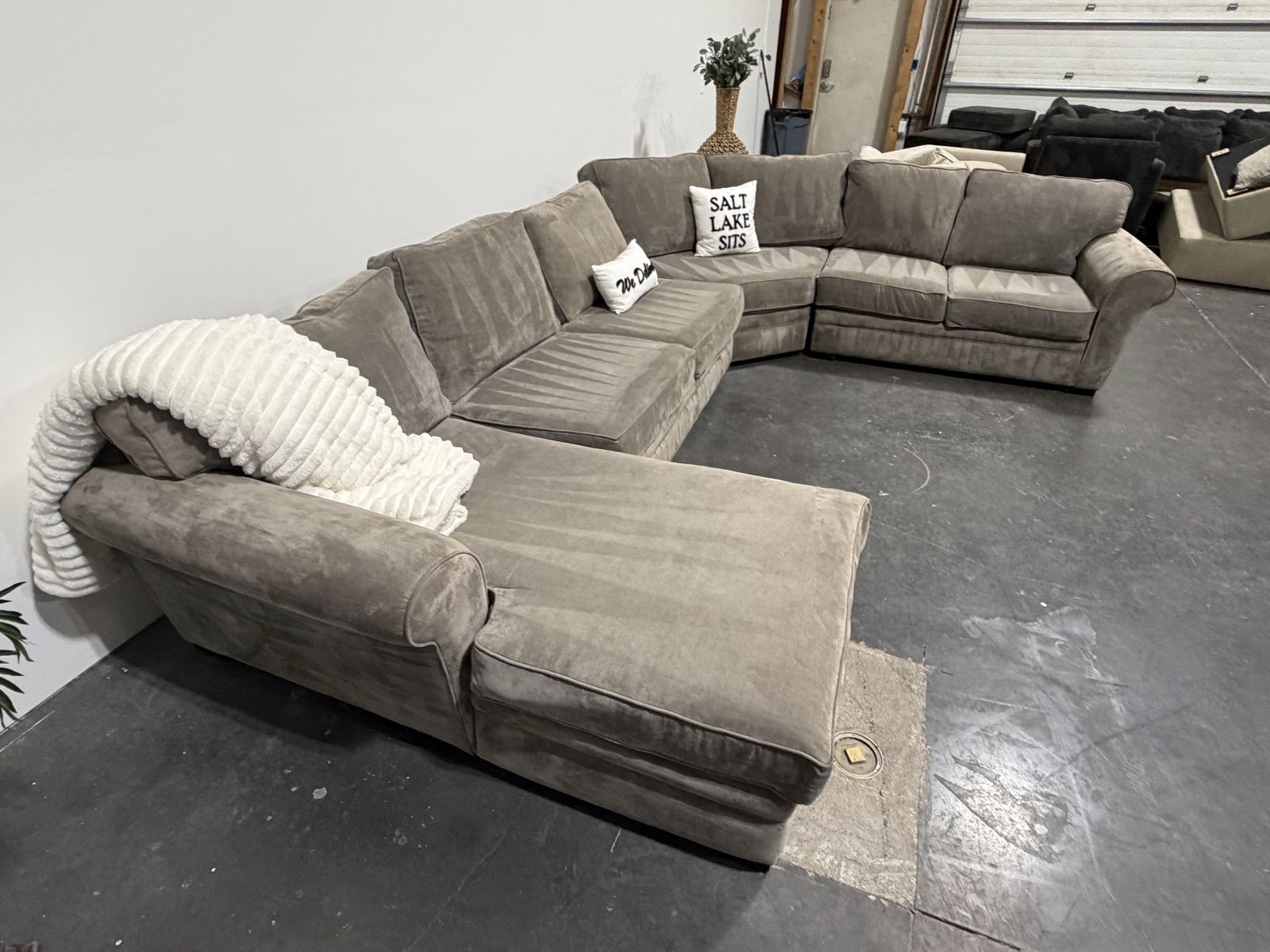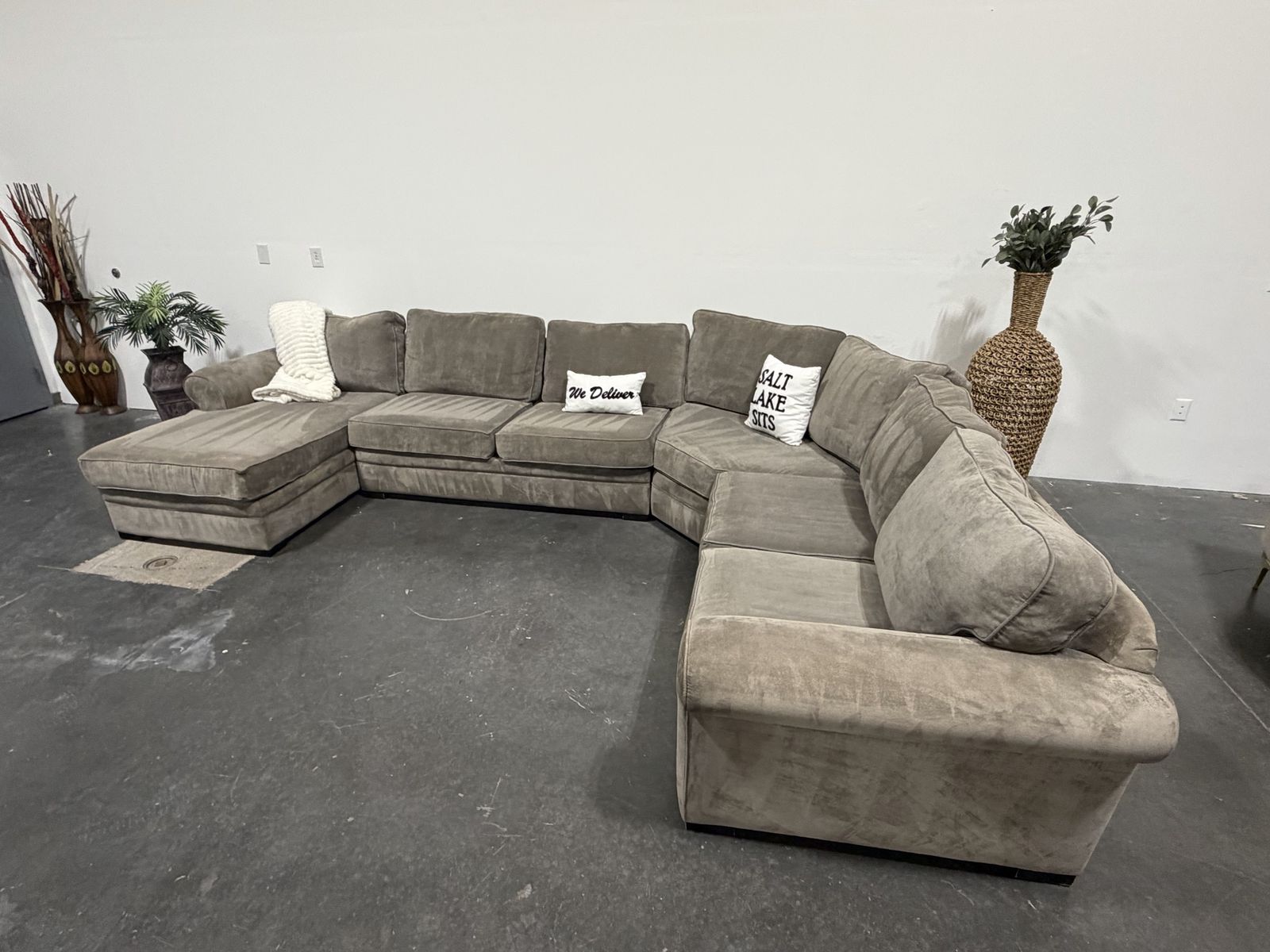154” x 112” 4 piece sectional with chaise in a neutral taupe color. Deep, comfortable seating with wide cushions and a clean, modern look. Spacious layout that offers plenty of seating and works well in larger living areas.