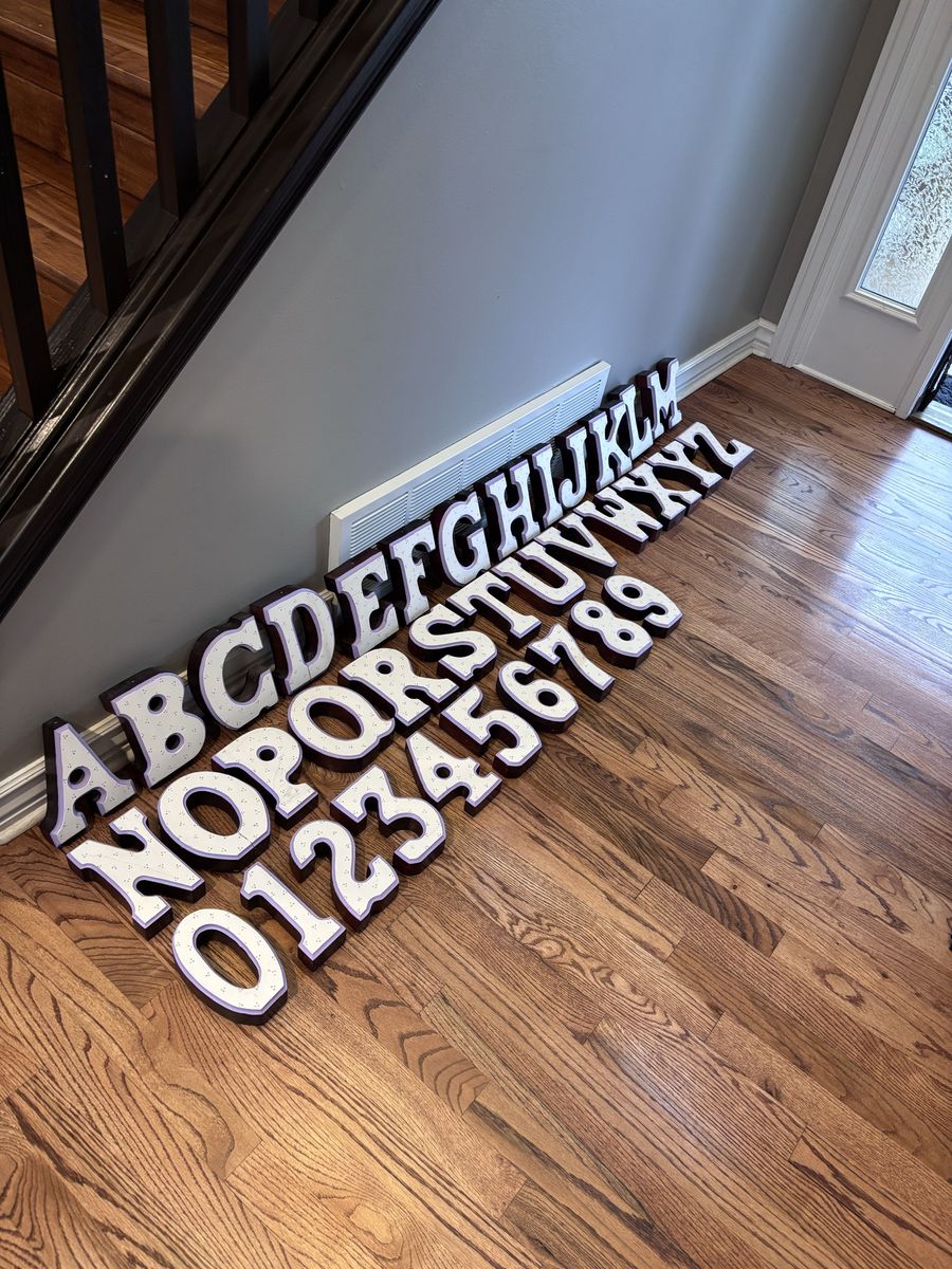 ZelleComplete set of decorative wooden letters A-Z and numbers 0-9. Hand painted. Each one is around 6” tall. Can be wall mounted with double sided tape or hung with hook and ribbon.