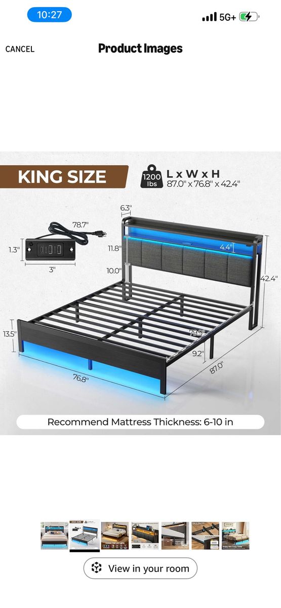 Modern platform style with built-in LED lights and charging ports (USB + outlets) in the headboard. Everything works perfectly. Super convenient and looks great in any room.