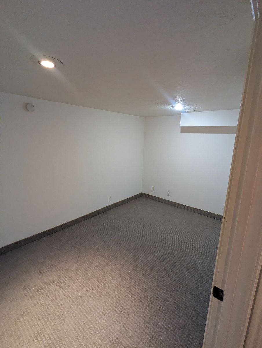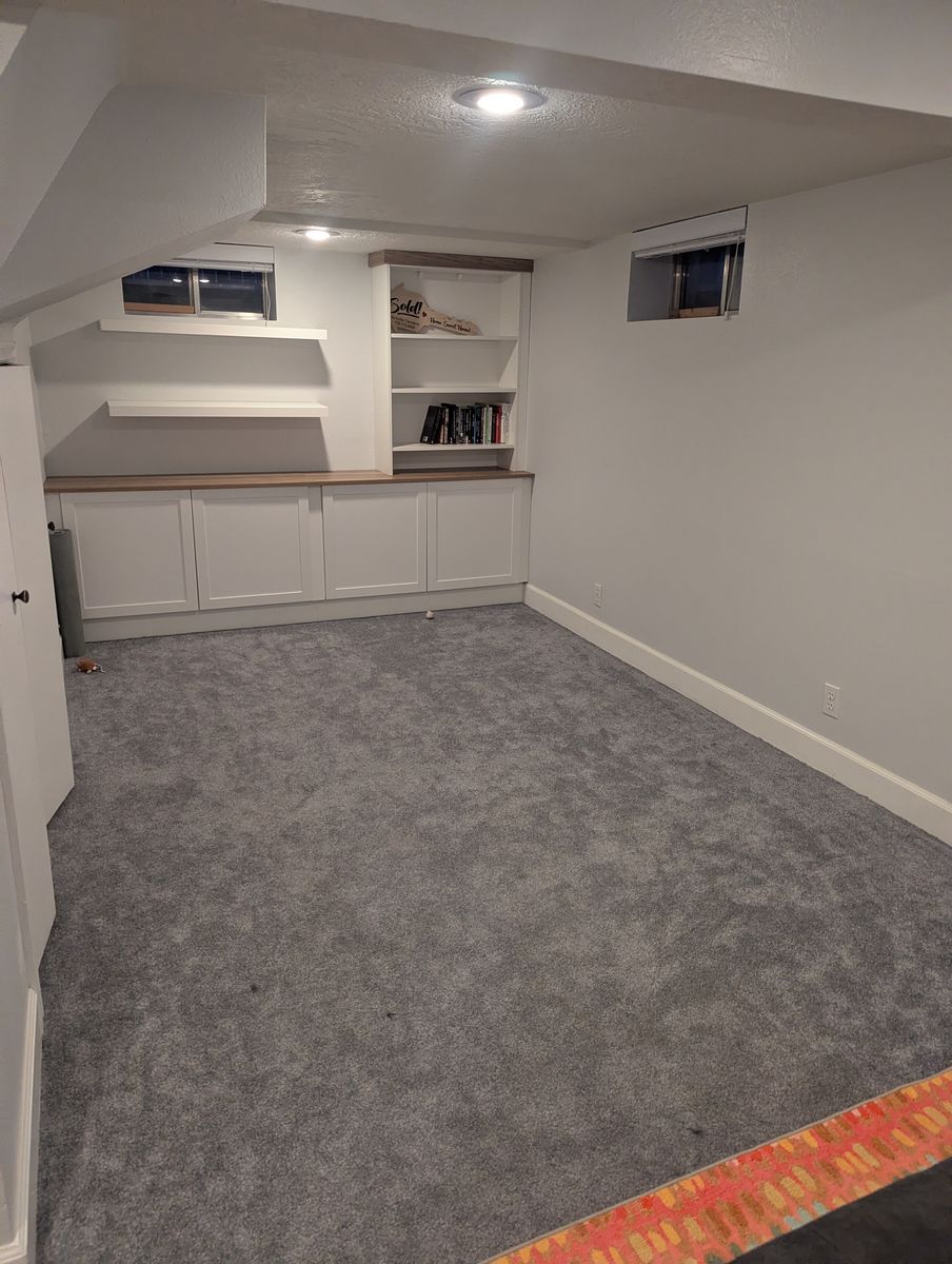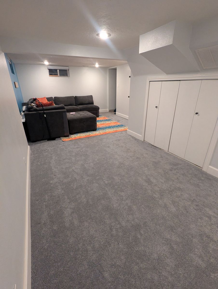 Shared basement living area with couch