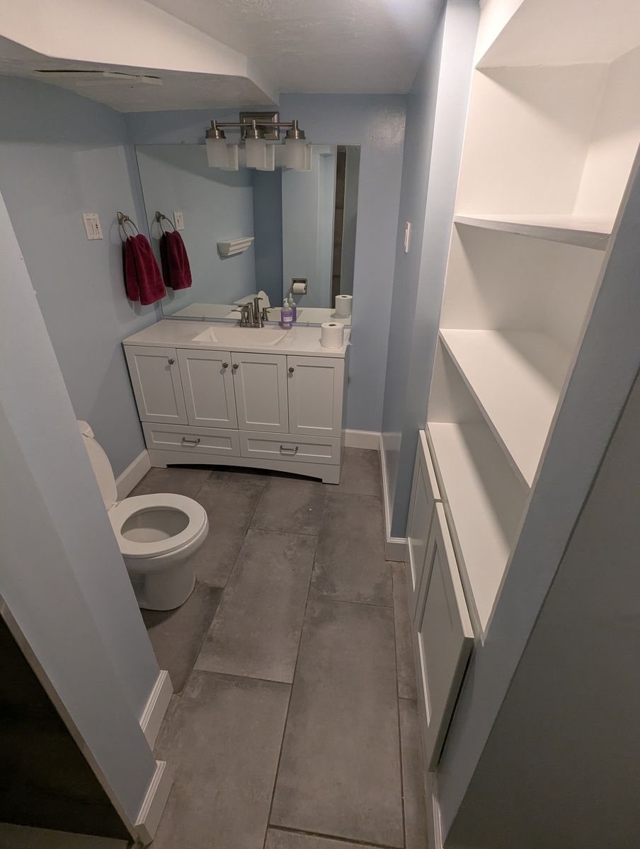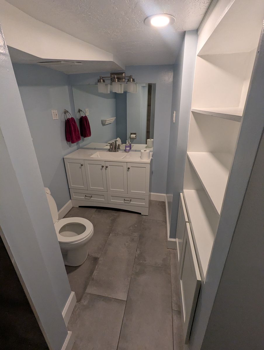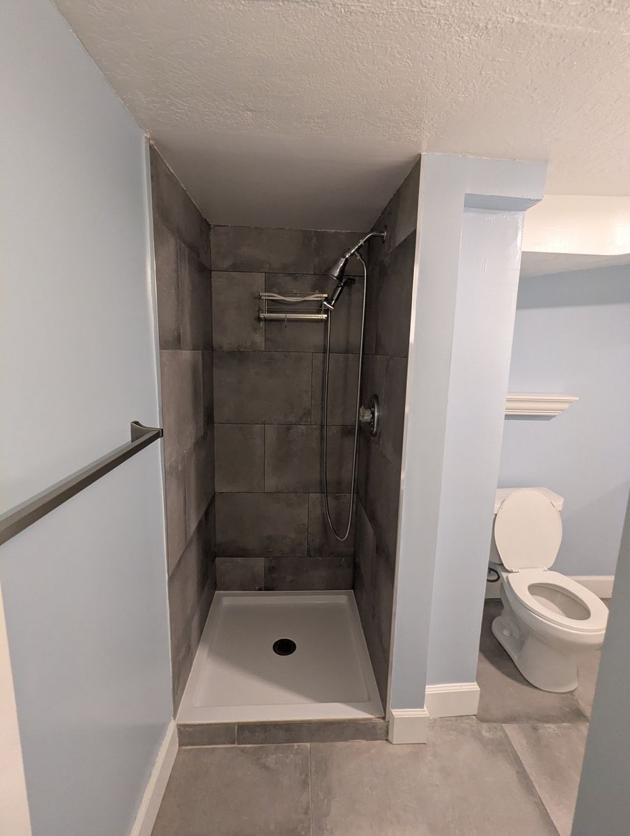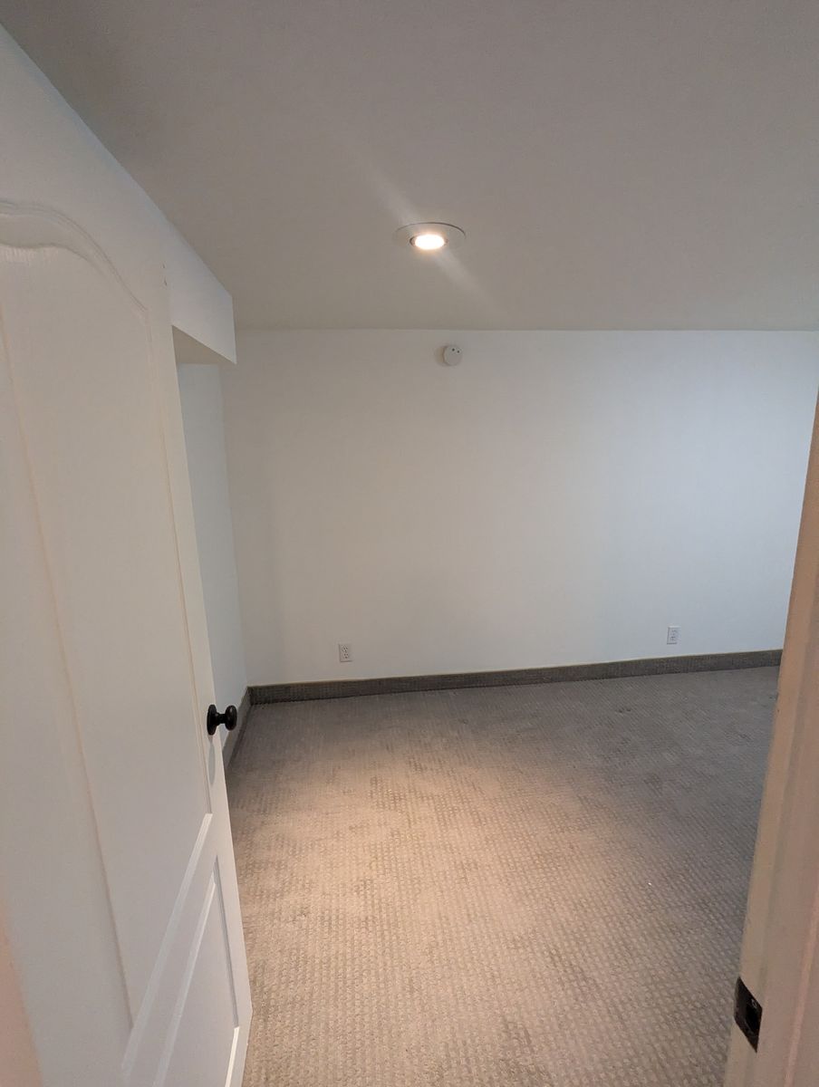 Shared basement living area with couch