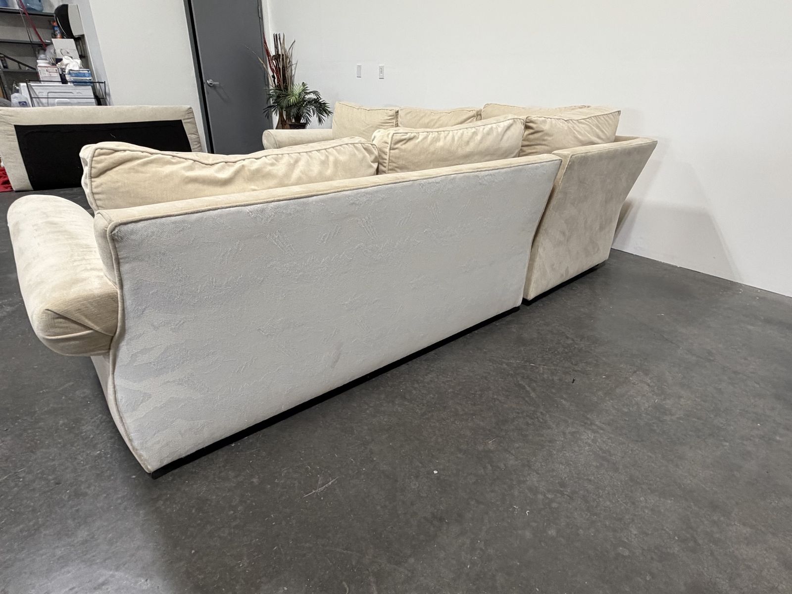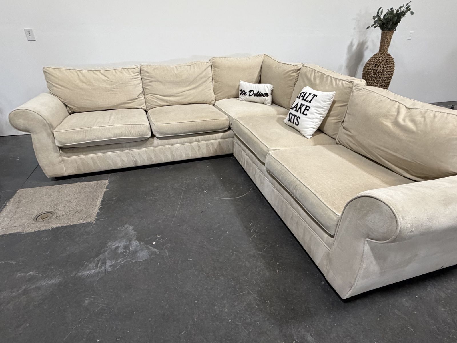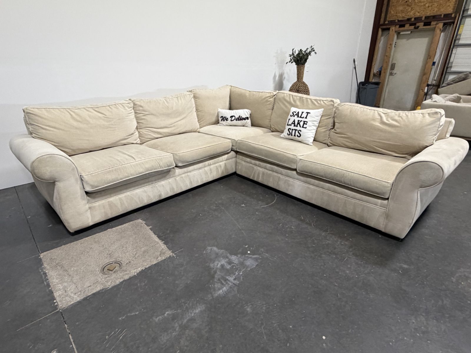 Follow Us On Instagram: SaltLakeSits Retail Price: $6000 Your Price: $799 ‼️Save Over 80% ‼️ ️ Beige Custom Plush Pottery Barn sectional with rolled arms and deep, deep cushions. Two-piece L-shape design with a timeless look and comfortable seating. Upholstered in a soft neutral fabric that works well in any space, with a custom white patterned fabric detail along the back that adds a unique touch. Spacious enough for family lounging or entertaining. 🫧 Expertly Cleaned 🫧 Dimensions: 112” x 112”
